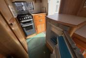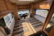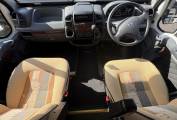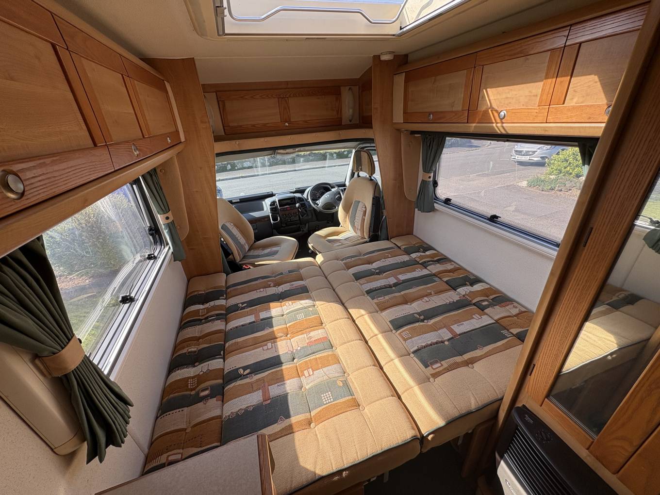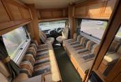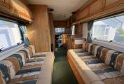 Moving forward is the spacious and bright lounge and living area with generous amounts of storage all around including a large wardrobe. All the fabric upholstery throughout this motorhome is in really nice condition. The lounge easily converts into a large double bed. You can use these benches as single beds as they measure 6'8 when you use the front swivel seats.