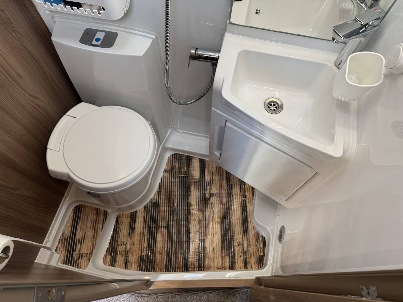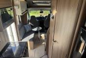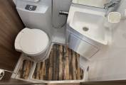 Moving through to the centre of the motorhome, there is a large washroom which includes a shower, wash basin with mixer tap, cupboards and a separate Thetford toilet with further storage units.