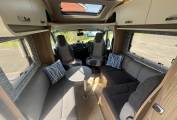 As we head towards the front of the motorhome, we come to the lounge/dining area where there are the rear two travelling seats form part of a L shape sofa along with the driver and passenger seats that both swivel to face the large dining table that is positioned in between which offers that warm family dining experience. Above the cab is the large deop down bed that can easily accommodate two adults.