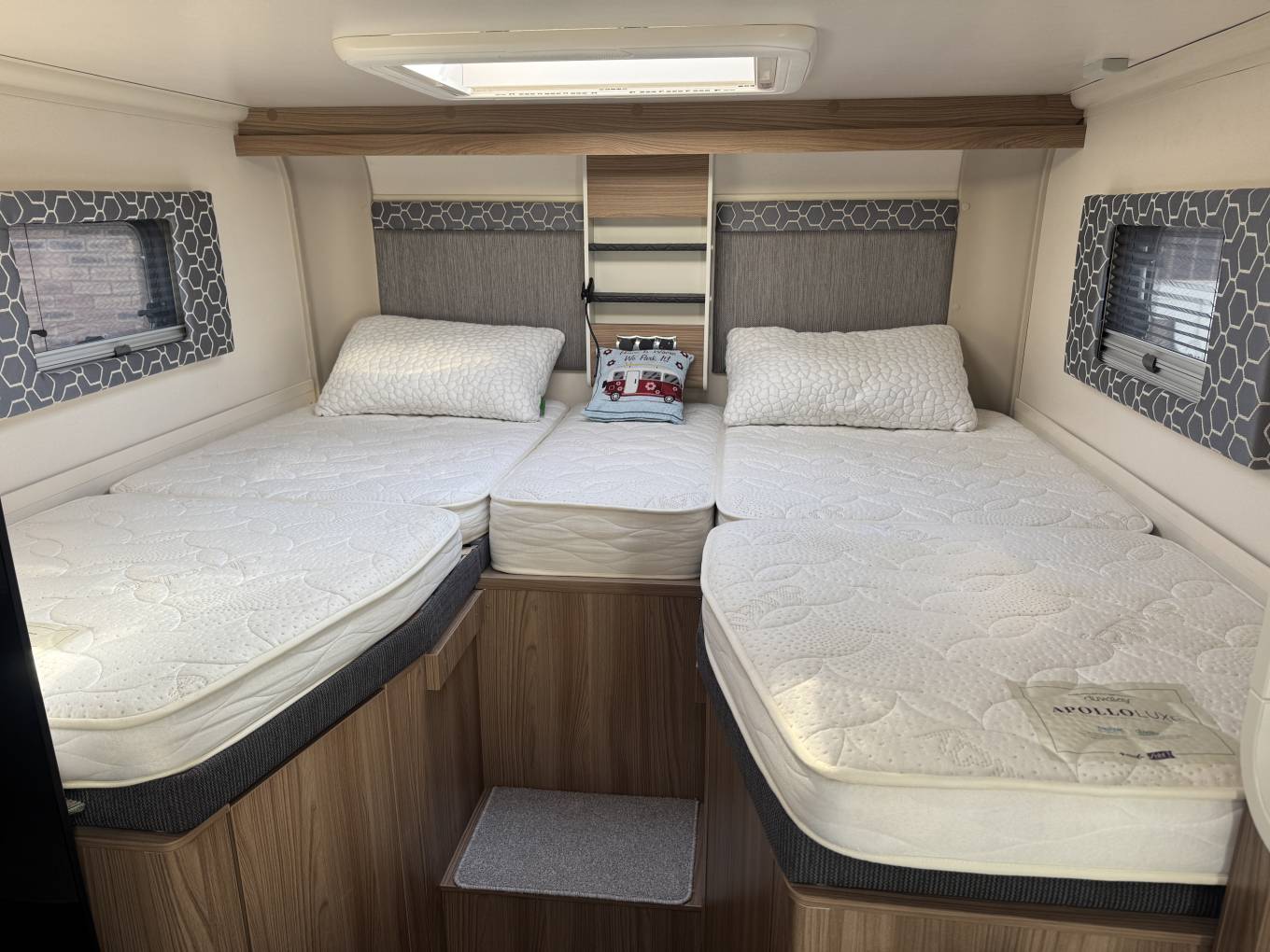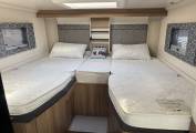 Starting with the rear of the motorhome, you have the extremely large fixed elevated Twin beds which are surrounded by multiple spot lights with plenty of storage space in the overhead cupboards. With the extra bed infill piece, this also makes a very large king size bed. Underneath the bed is the large garage which has plenty of room to store items such as a drive away awning, bicycles, luggage and many other items.