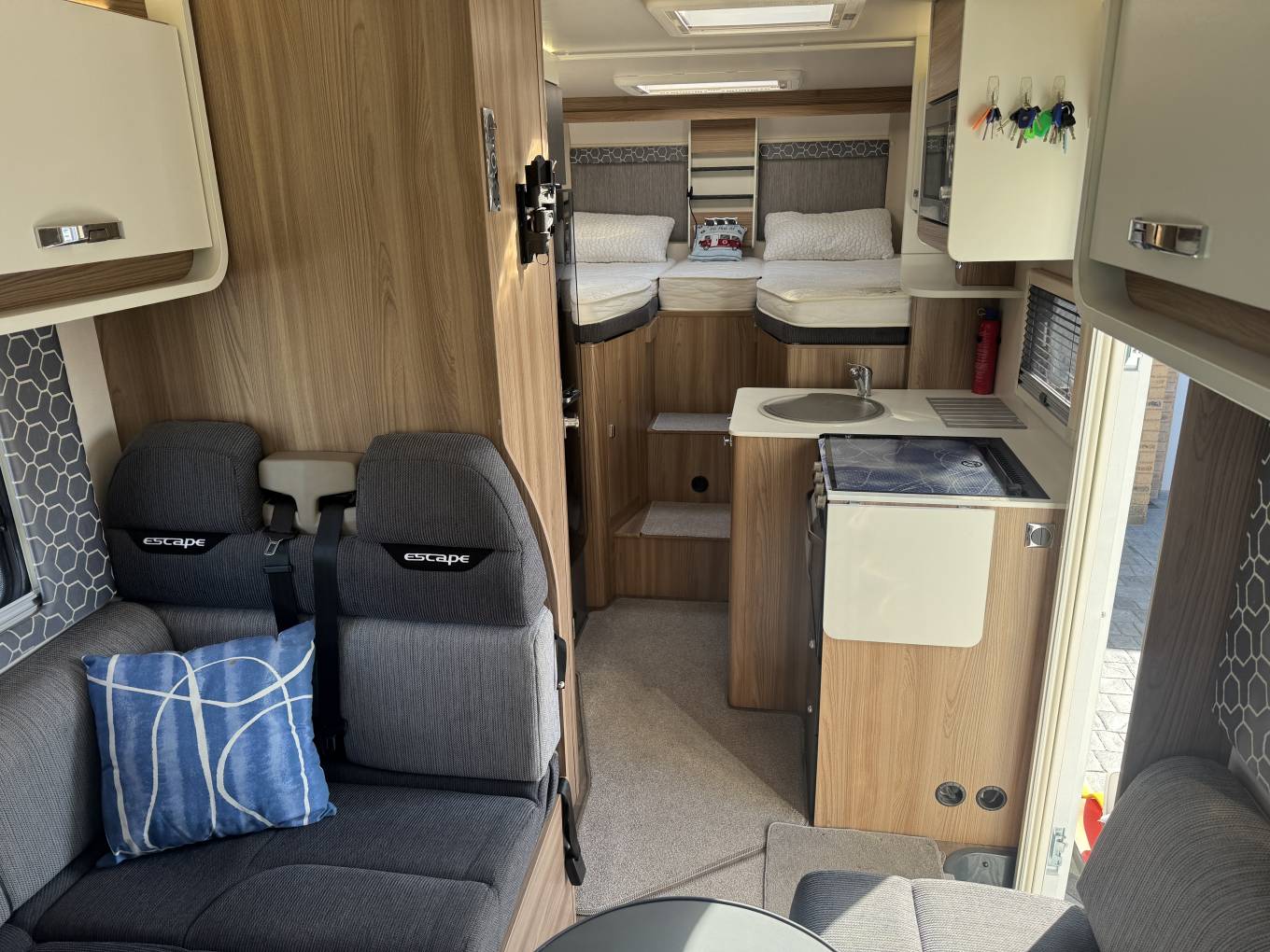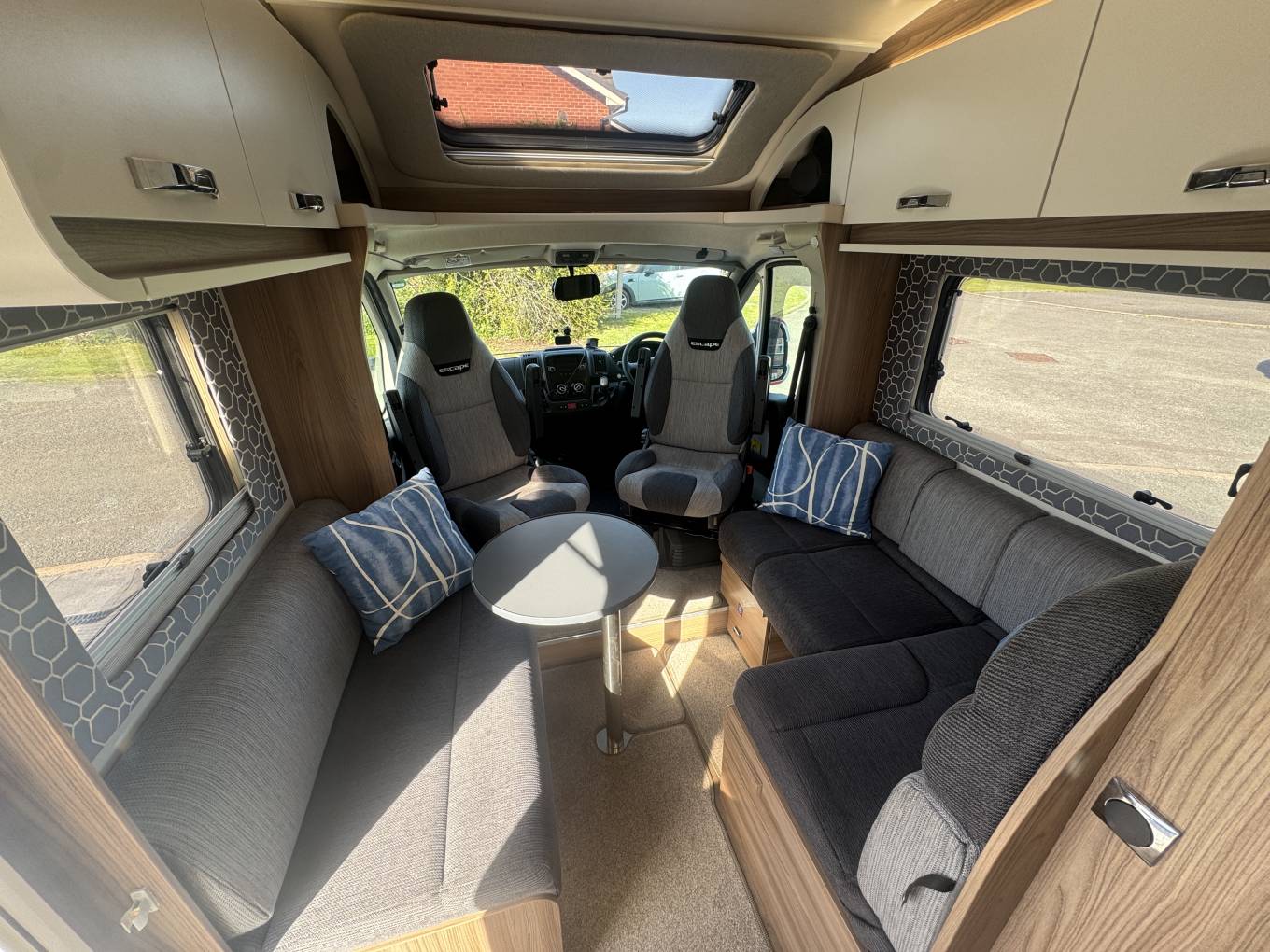In the cab, the vehicle has an automatic gearbox, a touchscreen interface which includes bluetooth phone, radio and reversing camera. There is also air conditioning along with electric windows and mirrors. Externally there is a wind out awning to allow al fresco dining, BBQ Point along with external storage lockers including the enormous garage.