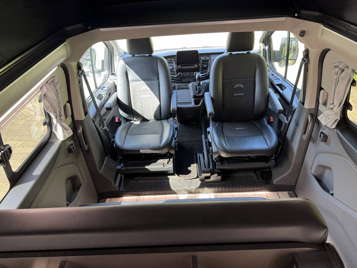 Inside, the camper is well-equipped for modern living, with ambient lighting to create a cosy atmosphere in the evenings, wireless charging pads, and USB-C ports to keep your devices powered. The fold-out table, combined with swivel front seats, creates a welcoming dining or social area—ideal for relaxing after a day of exploring. Blinds or curtains are fitted throughout, providing privacy and allowing you to camp comfortably wherever you choose.