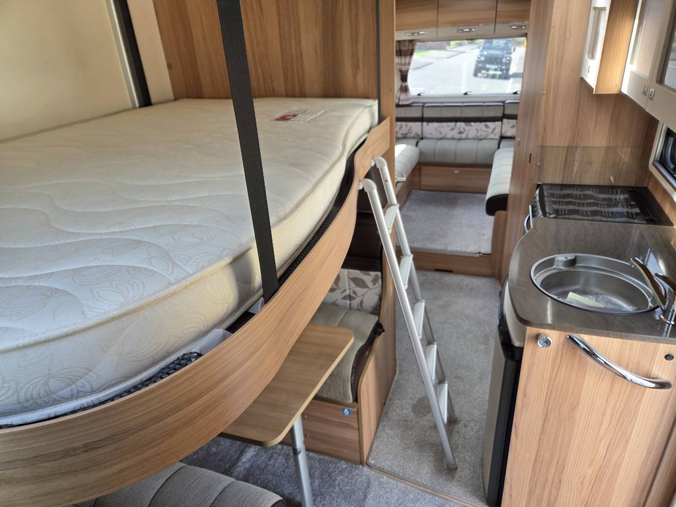 The bed drops from the roof with the push of a button and makes a spacious double bunk bed. A great benefit is you can put all your bedding from the whole van on the bunk and press the up button and it all neatly stores away in the roof.