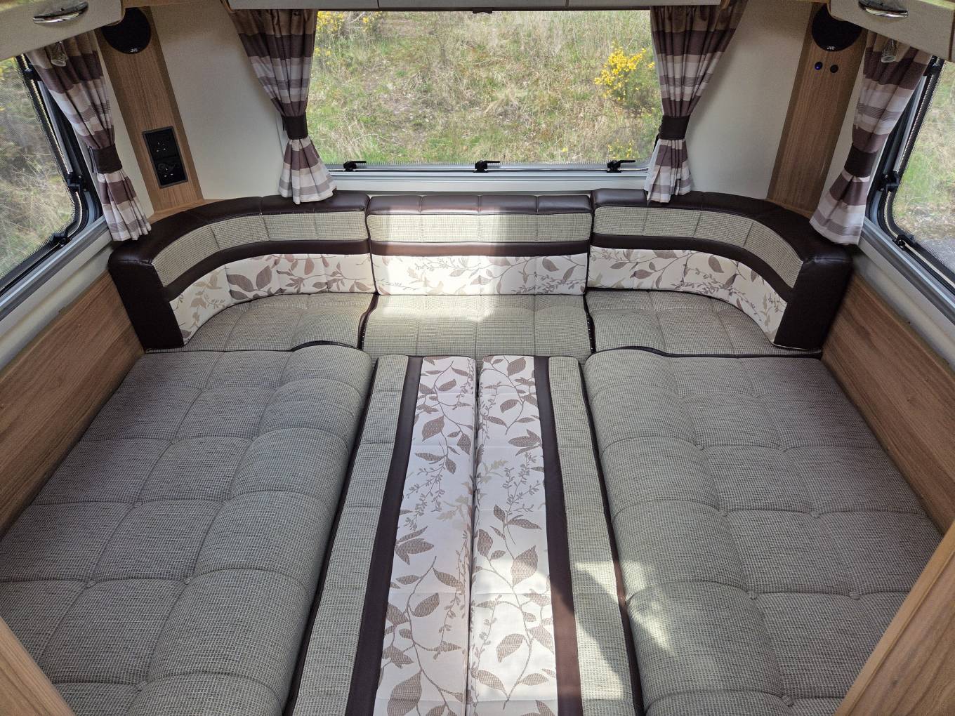 The kitchen is amazingly well designed. Full size cooker, 800w Microwave and a fridge/freezer. There’s two work surfaces, cup storage shelves, pan store, sink and drainer, utility store with two pull out shelves, a bottom bunker and two good sized top cupboards. There’s also two smaller cupboards above the microwave.