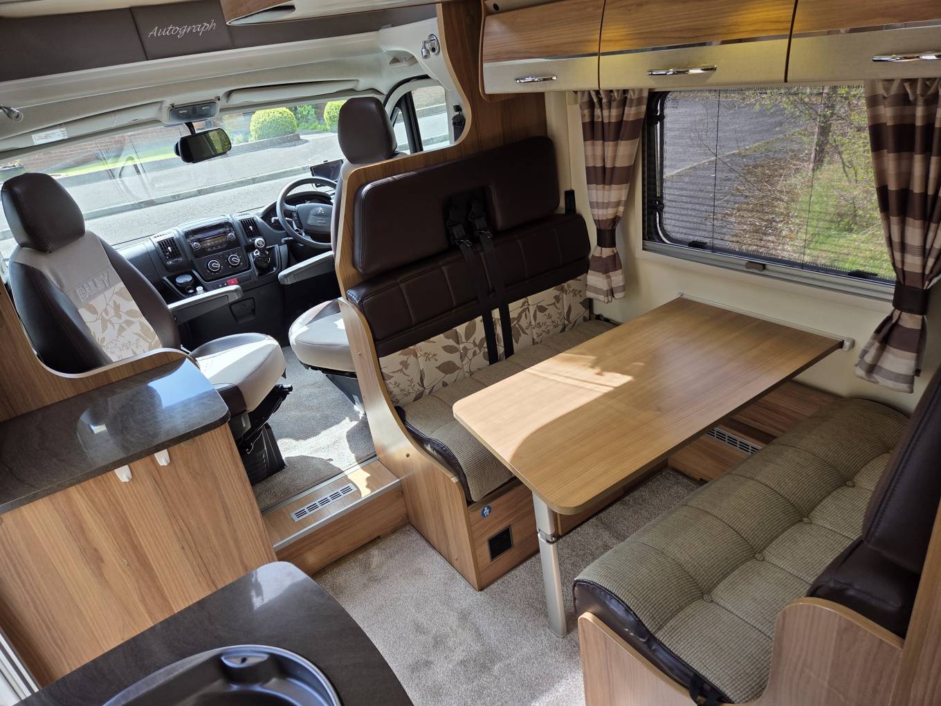Under the drop down bed is a further seating area which has four seats and a dinette table. All of these seats are fitted with three point seatbelts which neatly fold away when not travelling. The seats convert to another double size bed.