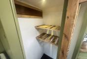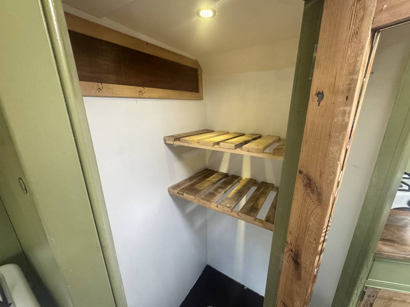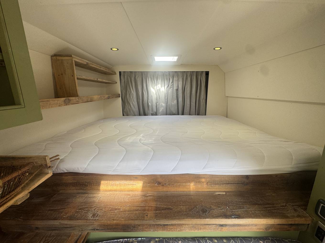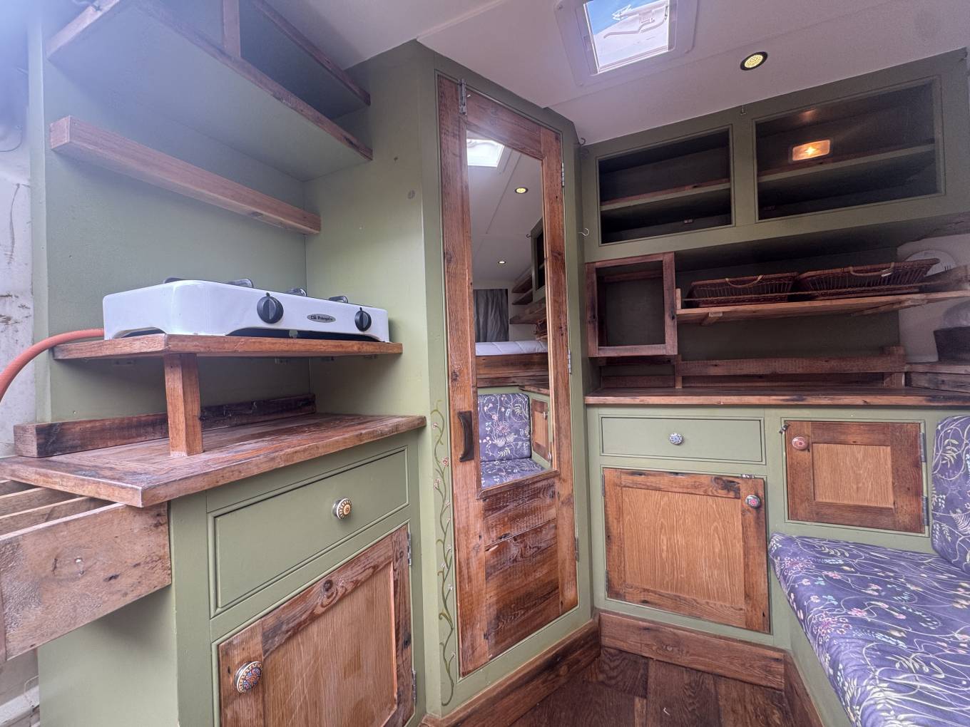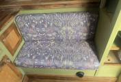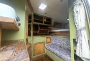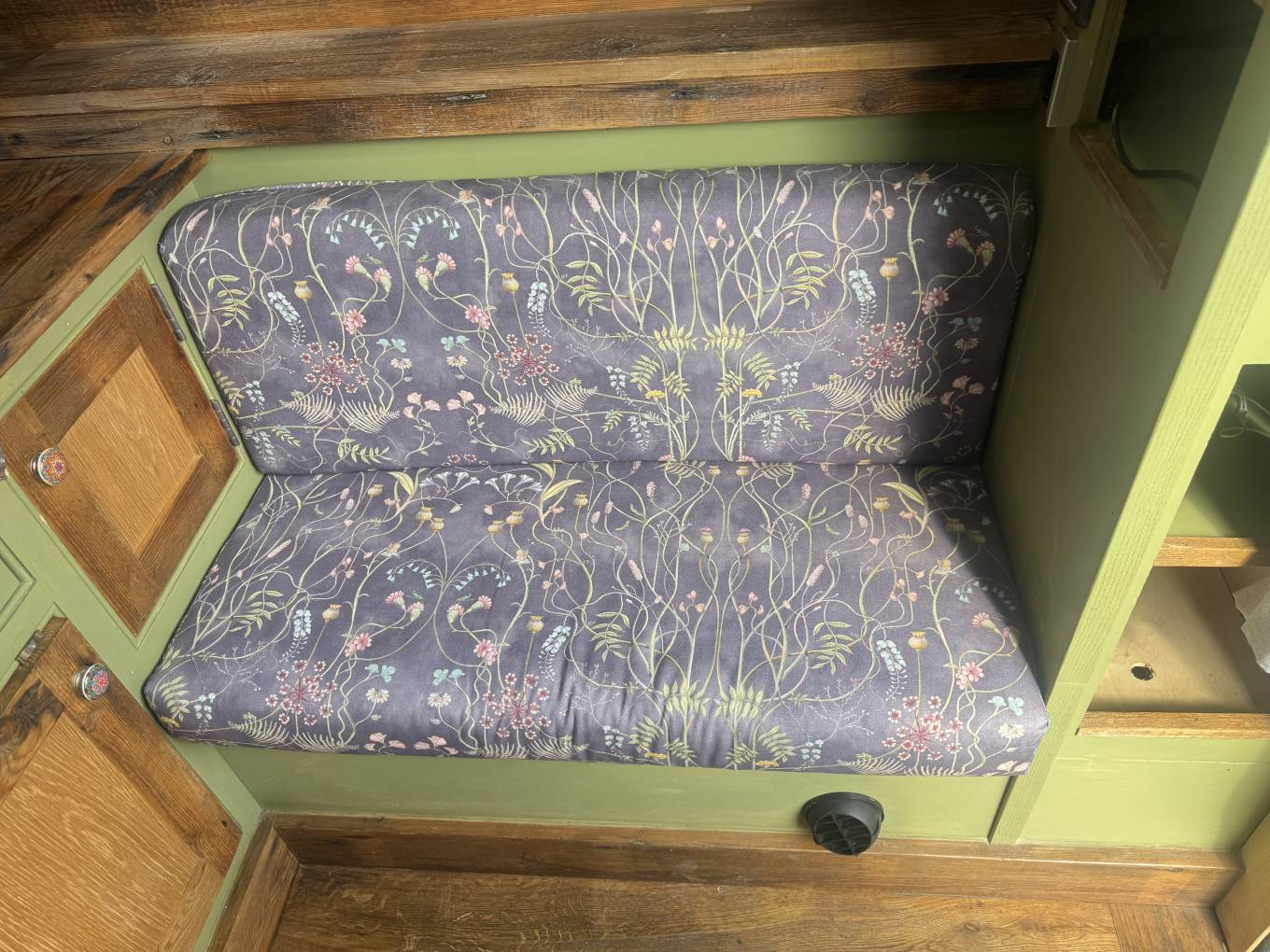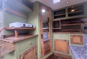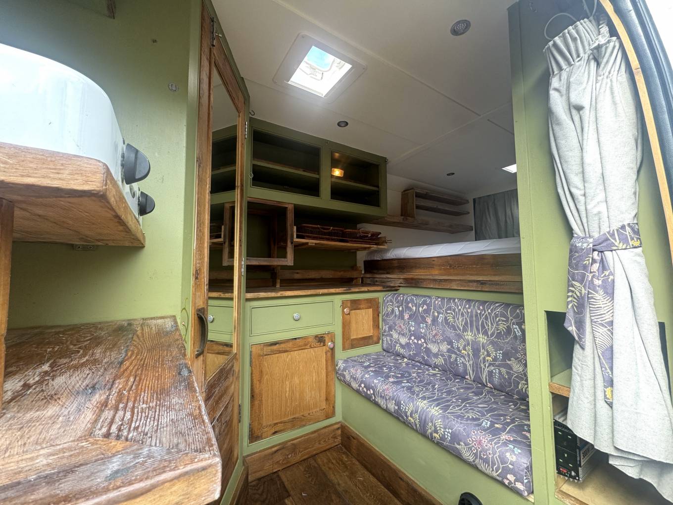 The interior has a unique handcrafted feel, with natural wood finishes and green cabinetry giving it real character. The side seating area provides a comfortable place to relax, and the inclusion of three travelling seatbelts adds useful flexibility for additional passengers.