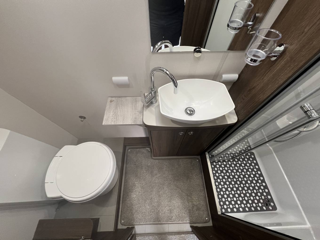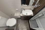 At the rear is the washroom which covers the whole width, with toilet, sink and shower with full enclosure. There is plenty of storage in here.