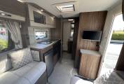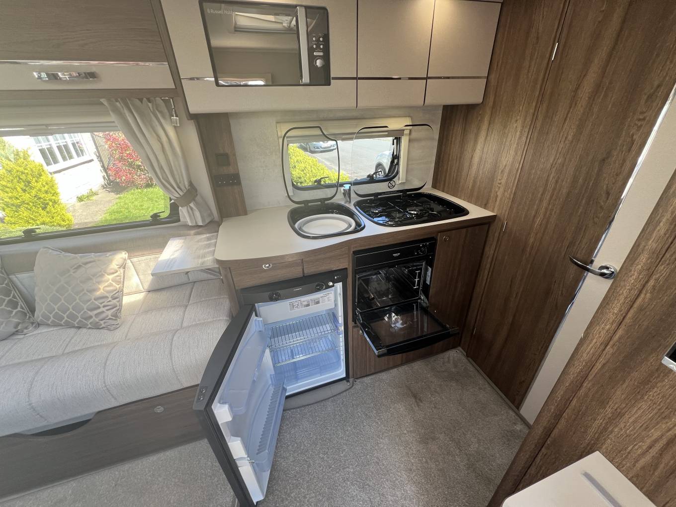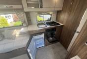 The side kitchen comes equipped with fridge freezer, sink, microwave, cooker with electric hob, 3 gas burners, oven, grill and a useful pop up worktop on the side.