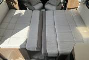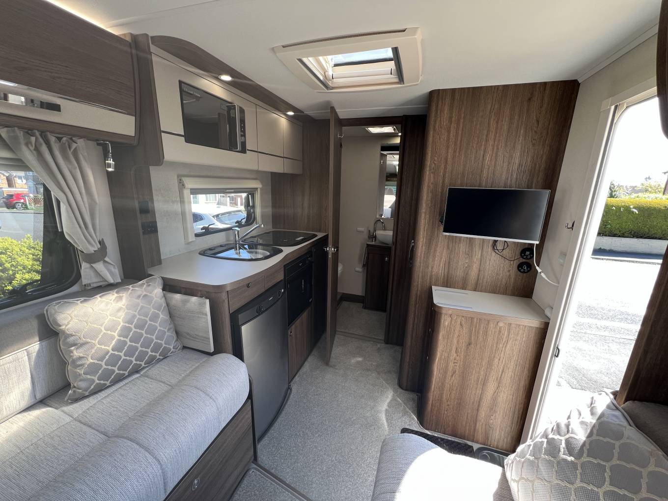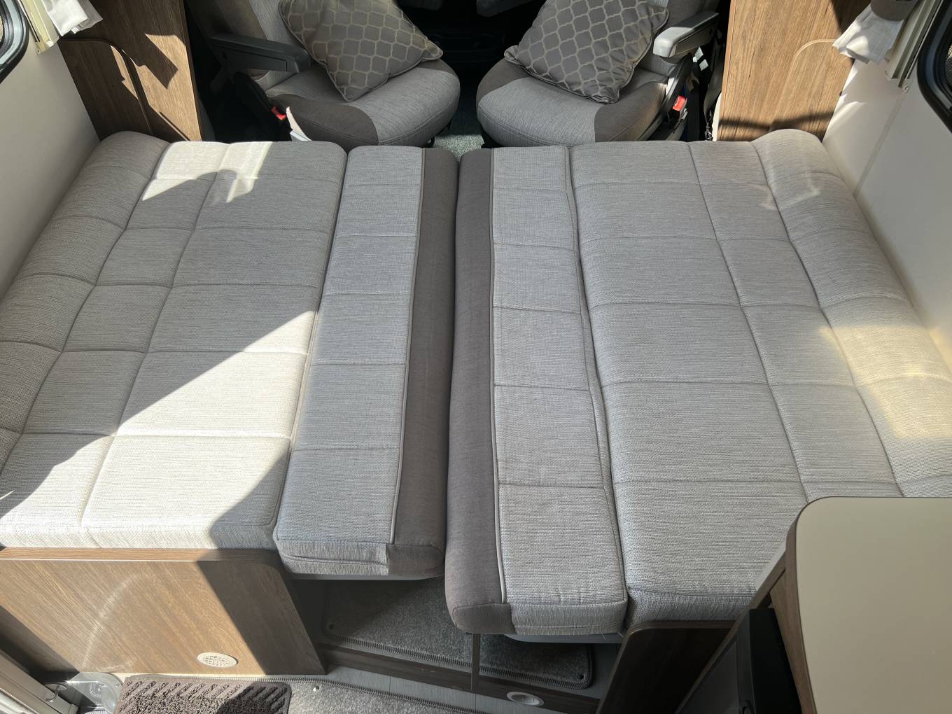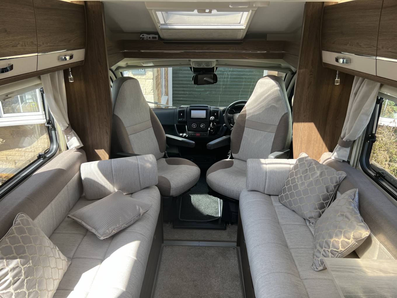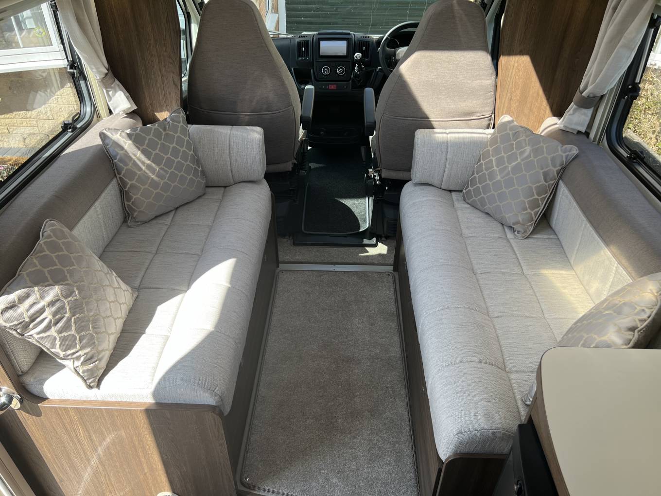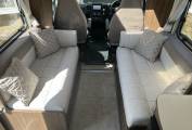 The basic layout is large washroom across the whole rear, kitchen opposite the habitation door, 2 sofas, that also are used for sleeping and 2 captains’ seats upfront.