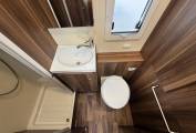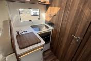 Moving to the centre you have the practical and well-appointed L shaped kitchen featuring a stainless steel sink with mixer tap, microwave, three-ring gas hob, oven and grill, large 3-way fridge with freezer and ample storage in drawers and cupboards. Moving to the rear is the spacious washroom with a separate walk-in shower, cassette toilet, large wardrobe and generous side storage cupboard.