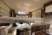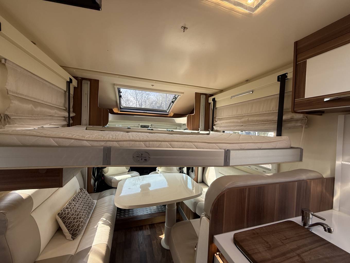The layout is as you enter the side door to your left you have large seating area with adjustable table, both front seats swivel round making this area a great area to relax or dine in. Above the lounge is the electrically operated drop-down double bed that will go down low for easy access.