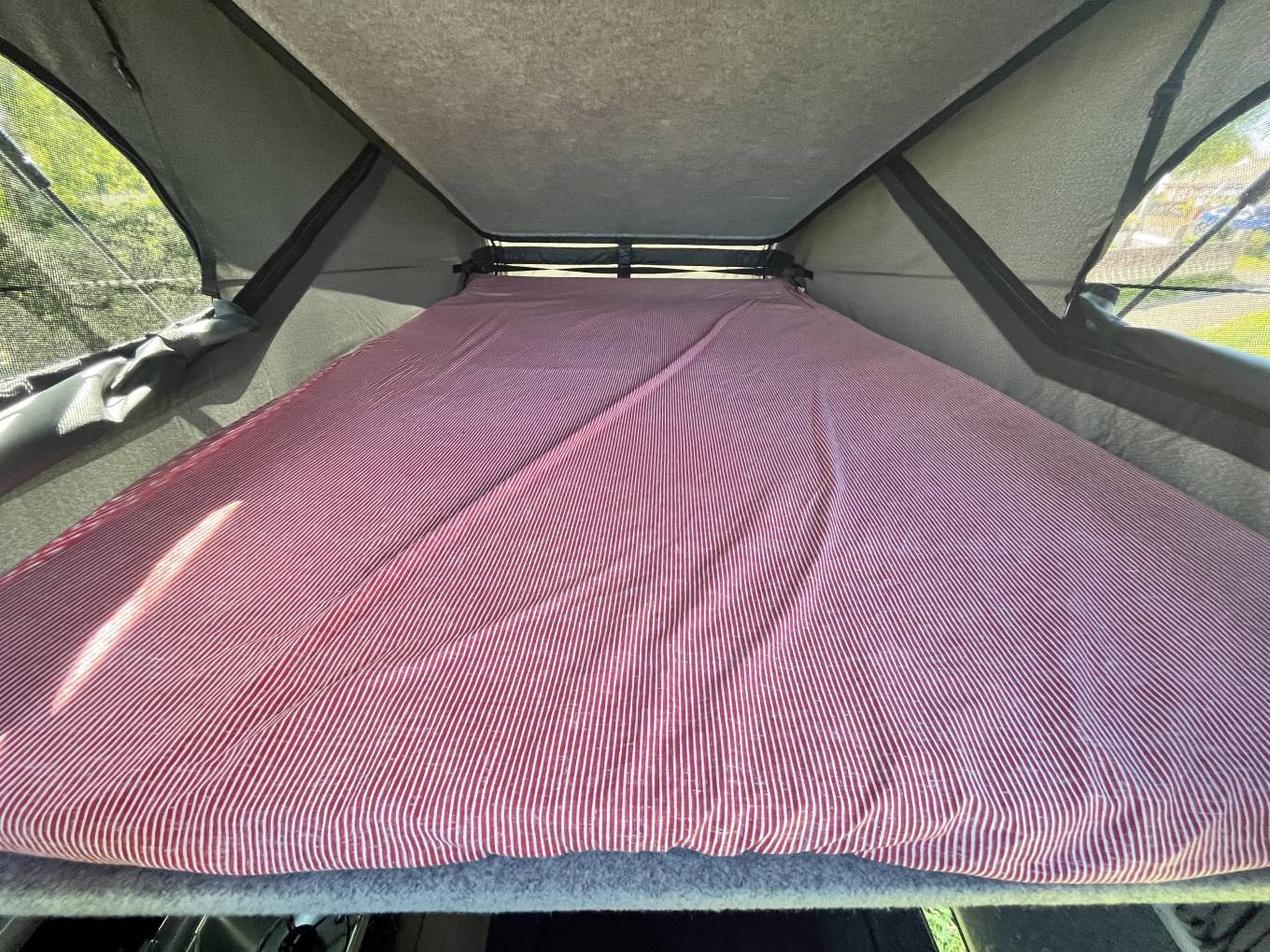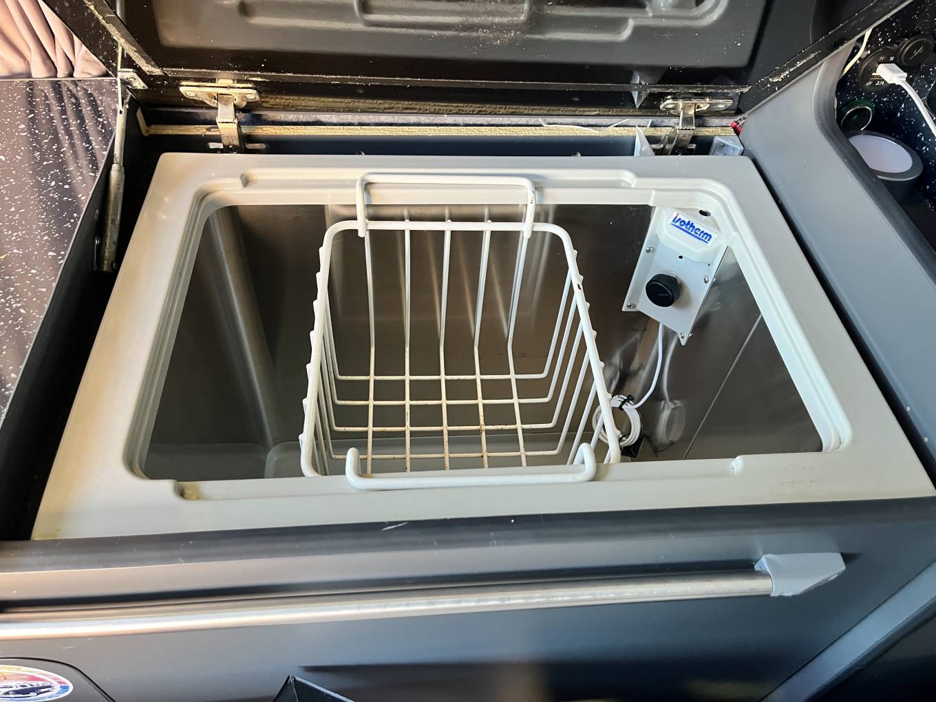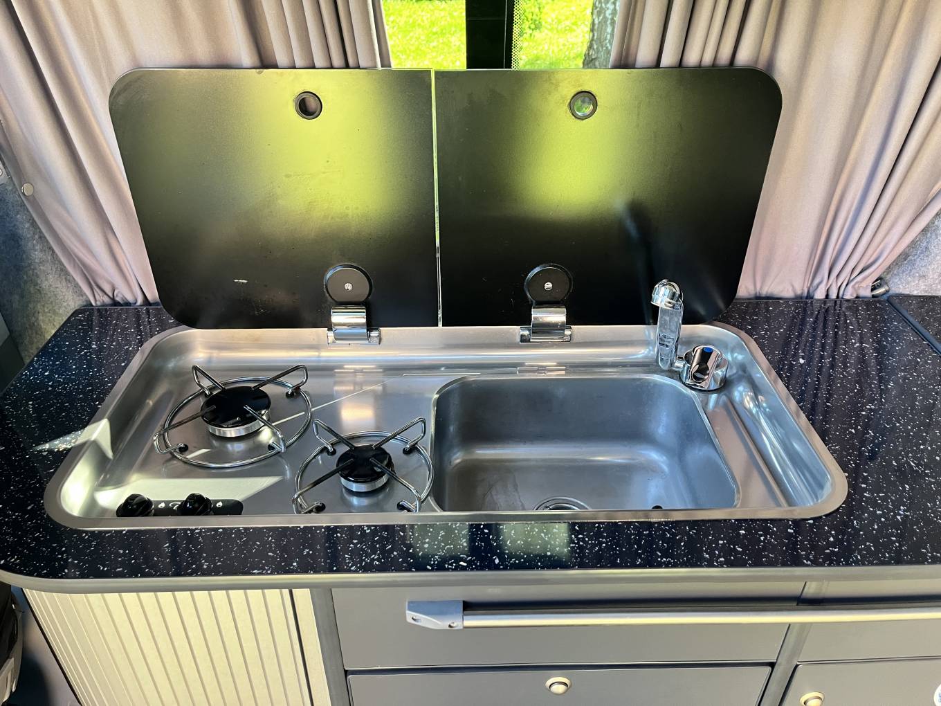Inside, the layout is side-converted to maximise space. Along one side, you’ll find a kitchenette unit equipped with a sink, gas hob, and a fridge, plus storage cupboards for food and utensils. Opposite, a rear bench seat during the day that folds flat into a comfortable double bed at night.