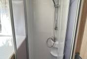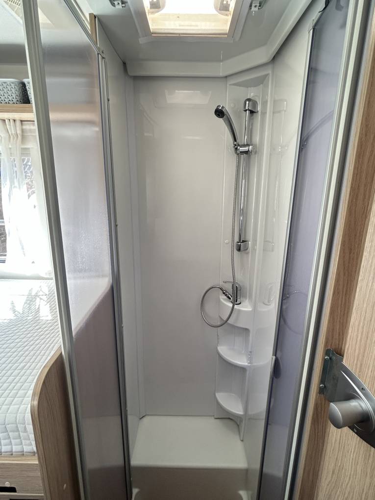 The washroom is split over both sides of the vehicle and features a large separate shower cubicle on one side and a Thetford cassette toilet, a wash basin with mixer tap and 2 bathroom cabinets on the other side.