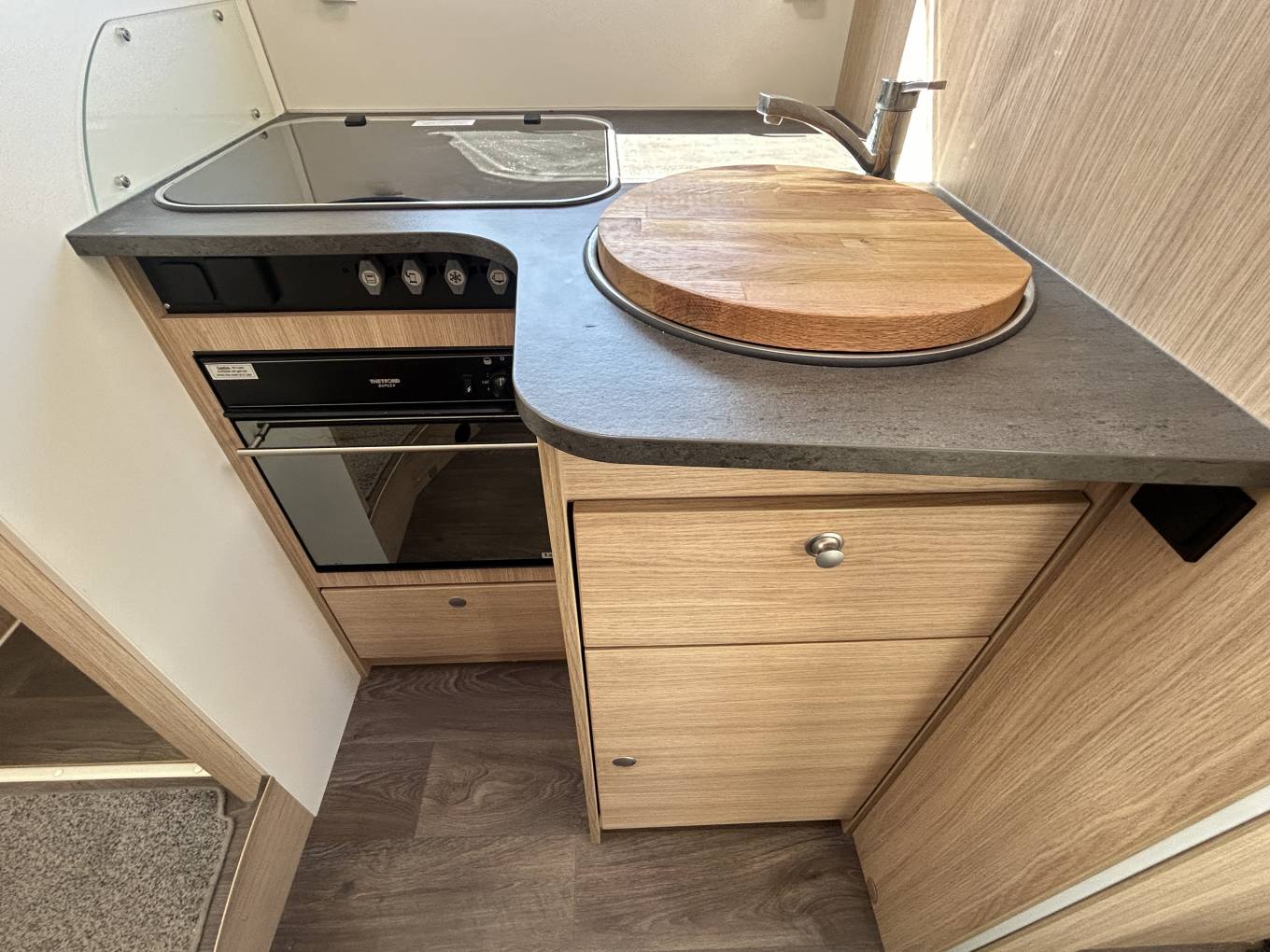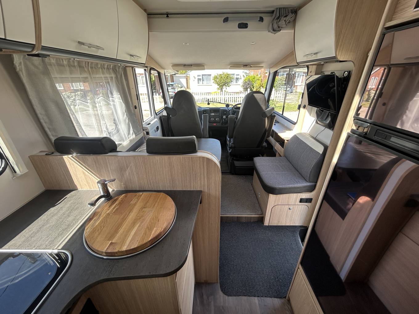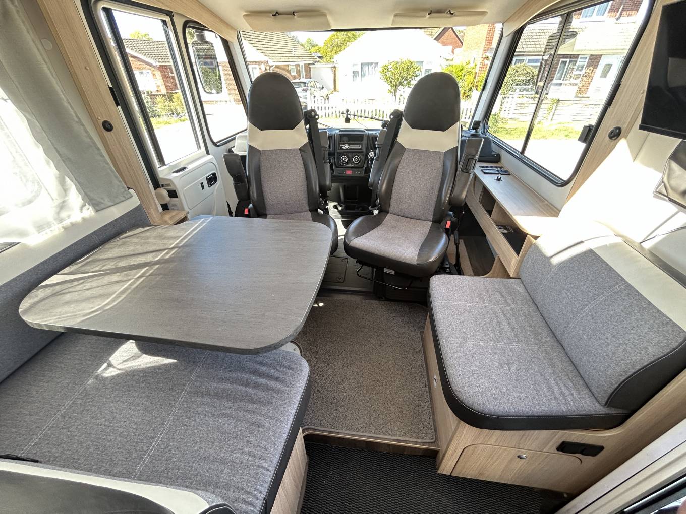 The lounge area is designed for both comfort and sociability, featuring two fully swivel cab seats, creating a welcoming seating area for relaxing or dining. Full cab blinds enhance both comfort and privacy, whether you're on a campsite or wild camping.