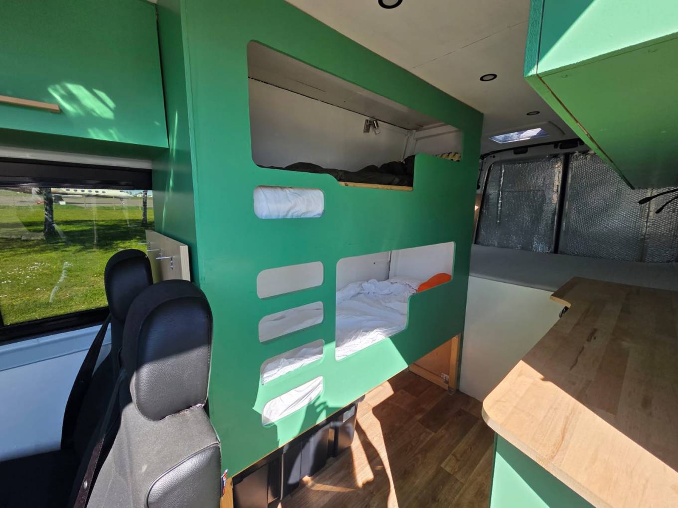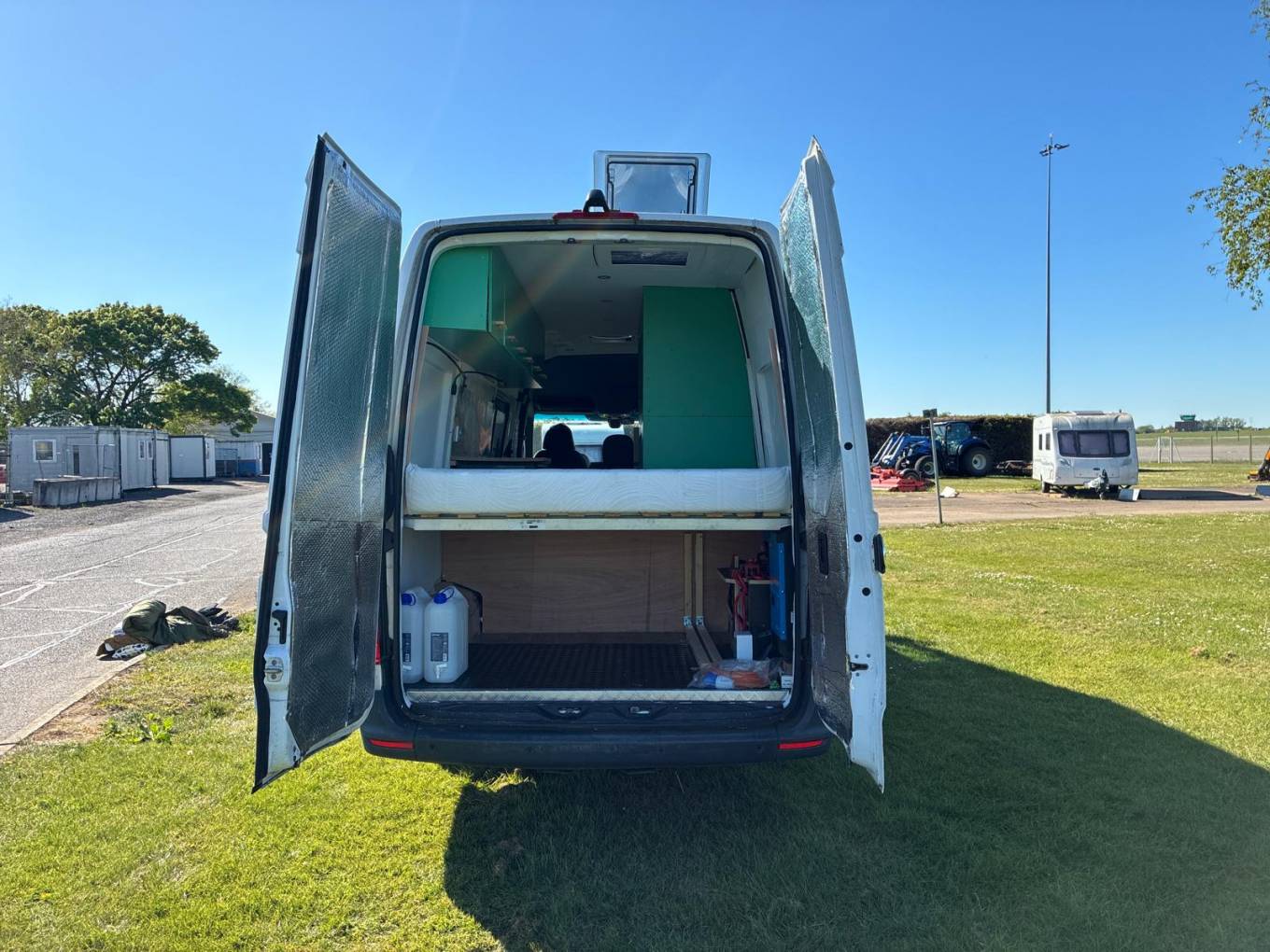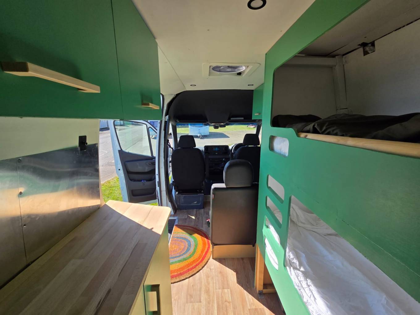 MOTORHOME DEPOT RICHMOND -UPON-THAMES are pleased to bring you this 2021 Mercedes Benz Sprinter | which has been self-converted by the current owner | finishing touches yet to be completed by current owner | vibrant green hand painted interior | 6 speed manual | 37,079 miles on the clock | Victron electric system | solar panel | OFF GRID READY | 4 berth - 1 x fixed double bed along with 2 x bunk beds RARE | suitable for young children | 4 x seatbelts - 2 x iso-fix for car seats | reversing camera | centre dinette area with removable dining table | 2 x swivel captain seats | fridge/freezer | 240v & 12v | plenty of storage cupboards including under bed storage