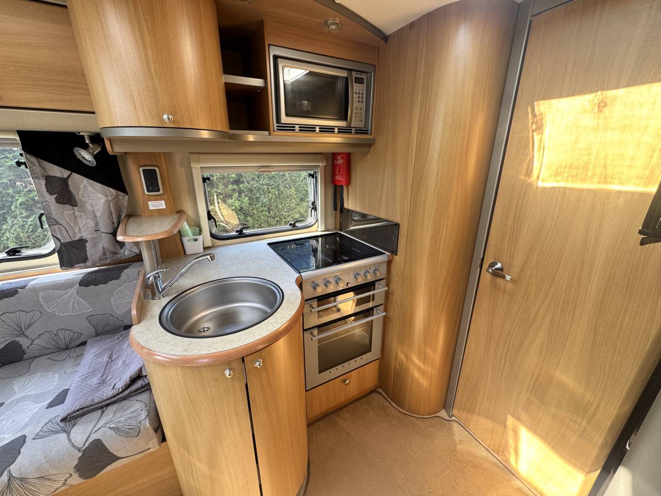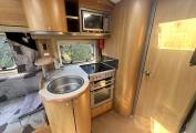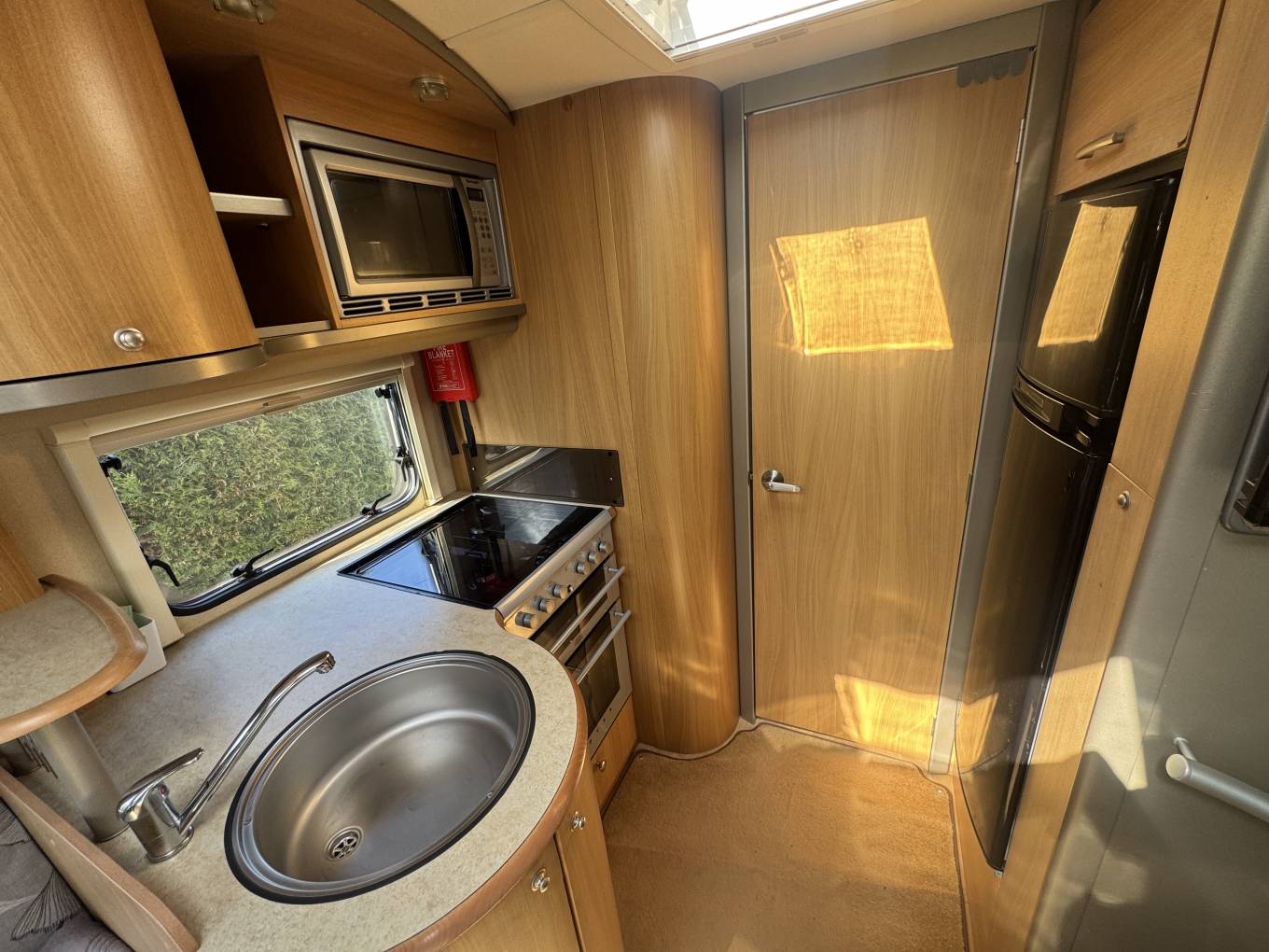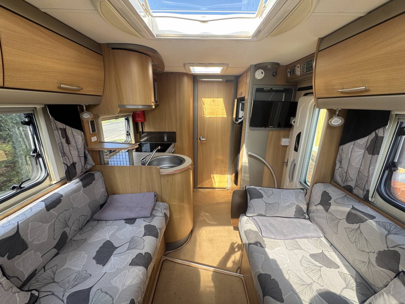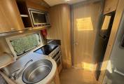 Inside, the layout consists of a spacious front lounge with two opposing bench seats, creating a comfortable daytime seating area. These benches convert into a double bed when required. Moving rearwards, the kitchen includes a sink, hob, oven and grill, microwave, fridge freezer, and good storage.