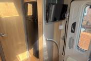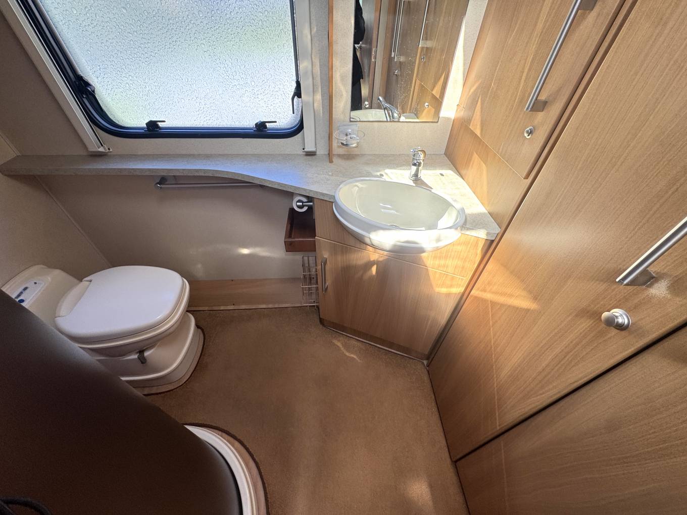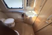 At the rear is the end washroom, offering a cassette toilet, wash basin, and separate shower area, giving a practical and spacious facility for touring.