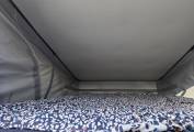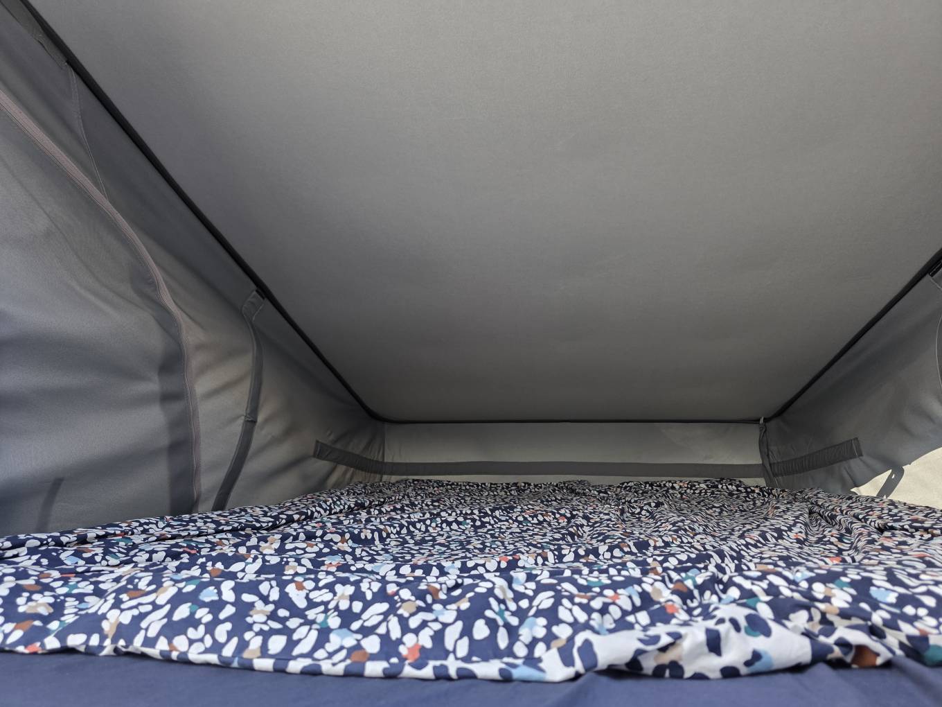 The pop top roof opens to reveal a second, large double bed accessed by ladders.
