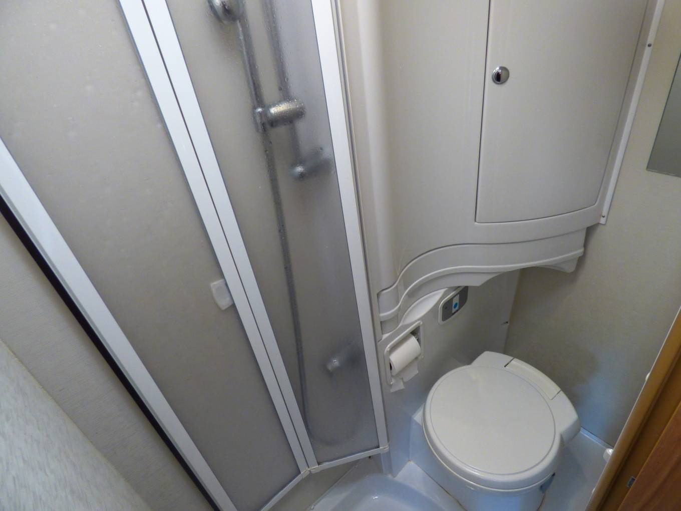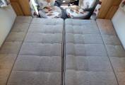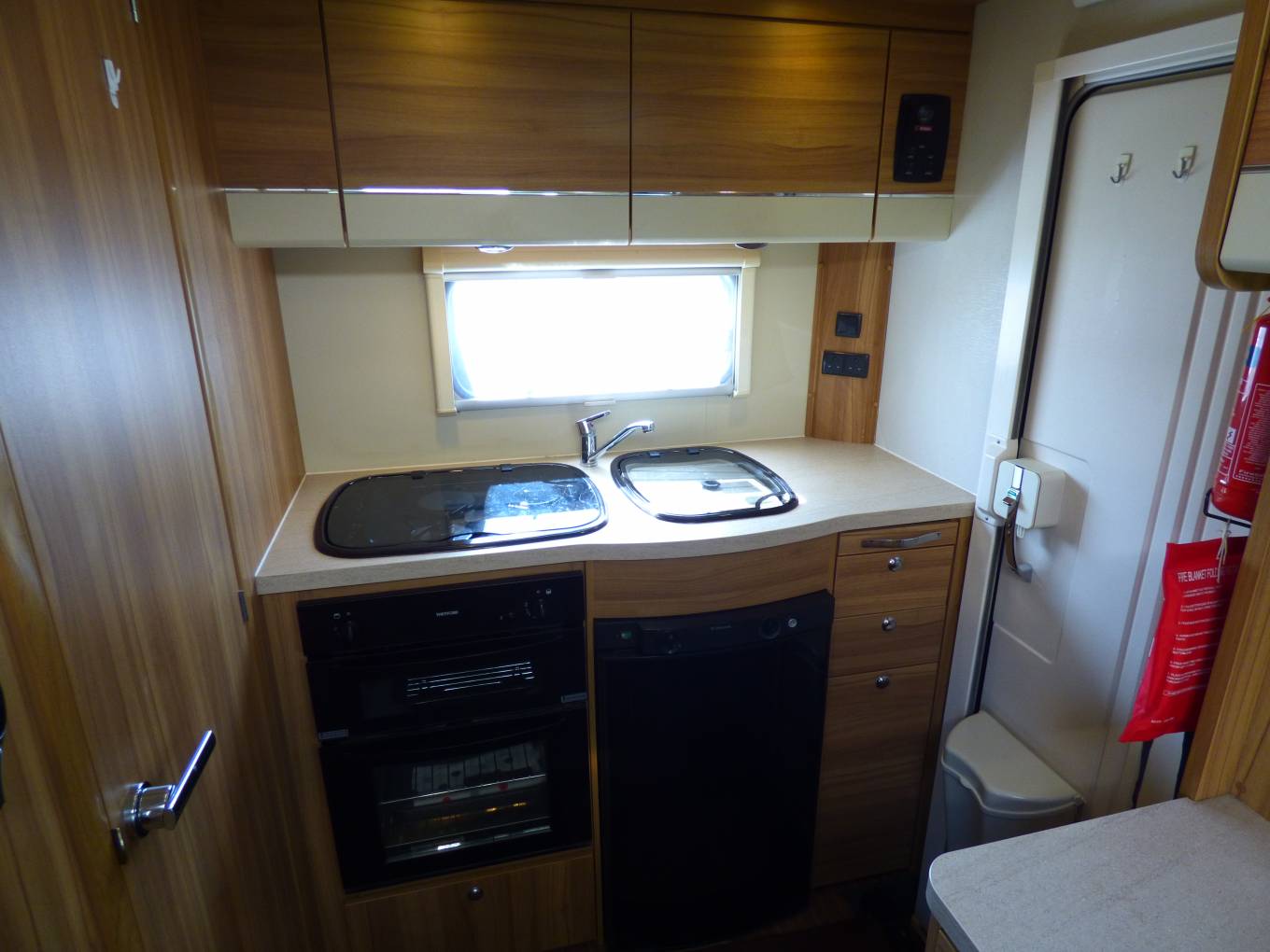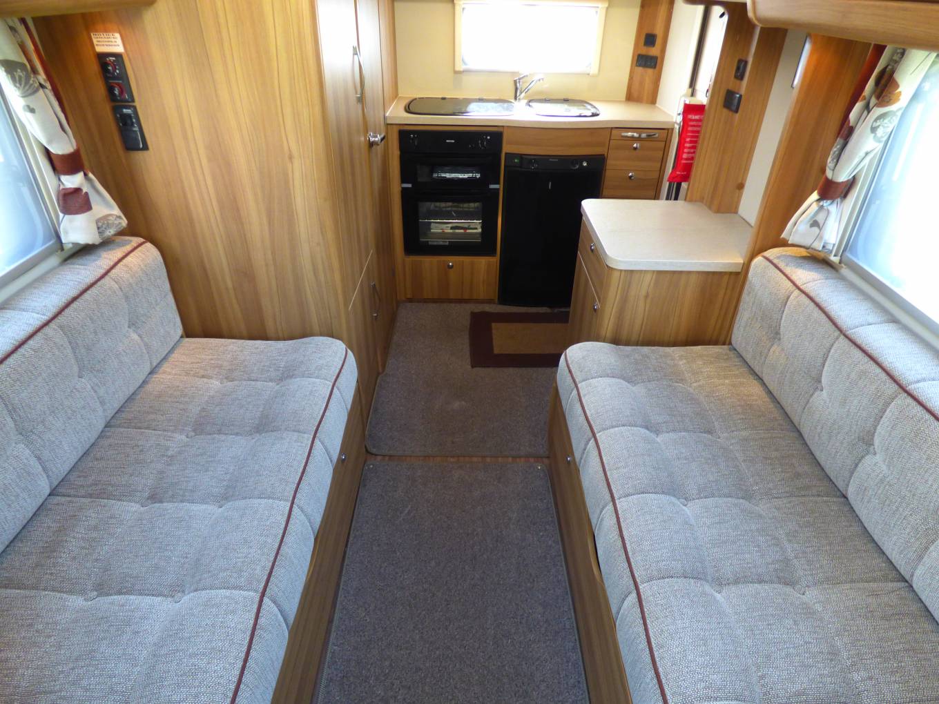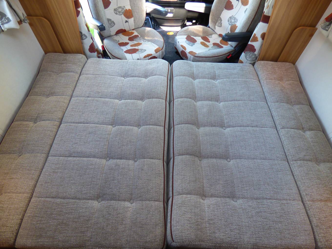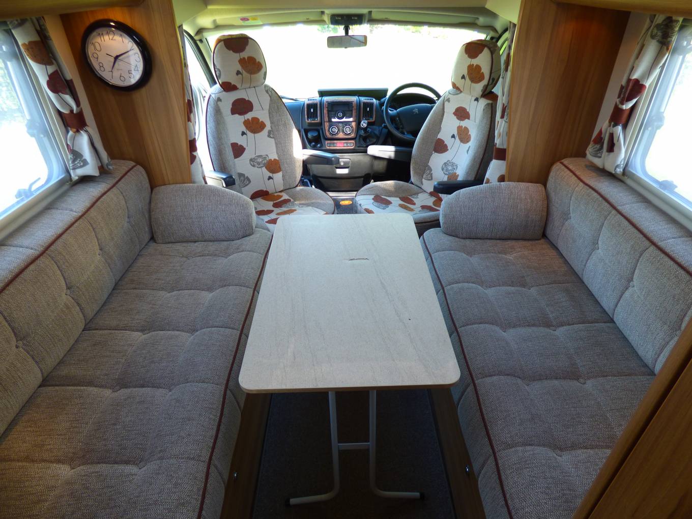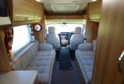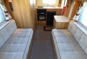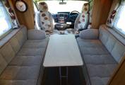 Next to the washroom is a large wardrobe unit with hanging rail and storage space including stowage for the dinette table. The dining/socialising area consists of two long bench seats facing each other and with the two cab seats turning to face the habitation area, 6 people can be comfortably seated. A TV/DVD is provided and this is a freestanding version usually watched on top of the storage locker beneath the microwave. The bench seats very quickly pull together to form a large double bed. Each window has flyscreen and nightshades whilst the cab windows benefit from Remis style blinds ensuring total privacy.