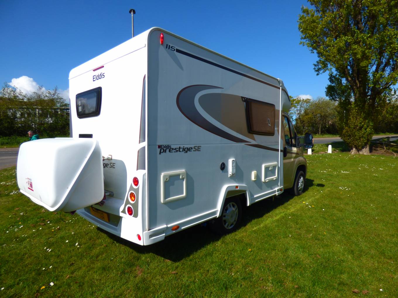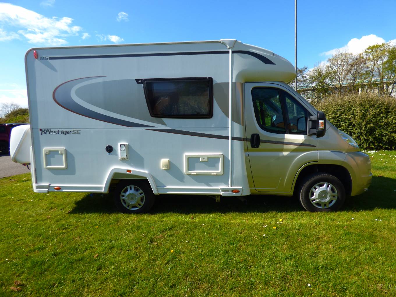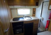 The Elddis Autoquest 115 on which this special version is based, is a always a very popular, compact motorhome for two people. It features a rear washroom with full height shower vanity unit, mirror and w.c. at the rear of the motorhome, next to a comprehensively fitted kitchen area including hob, grill, separate oven, fridge with freezer section, various drawers and lockers and a microwave.