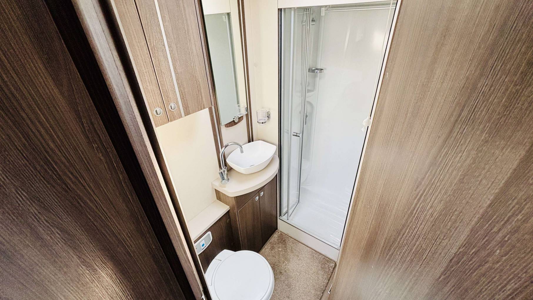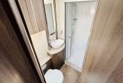 This is a 4 berth motorhome with 4 travelling seatbelts. The layout is both comfortable and versatile, featuring a fixed French bed to the rear, with excellent storage beneath, accessible from both inside and externally. Opposite, there is a large washroom complete with vanity sink, Thetford toilet and a separate walk-in shower cubicle.