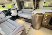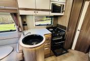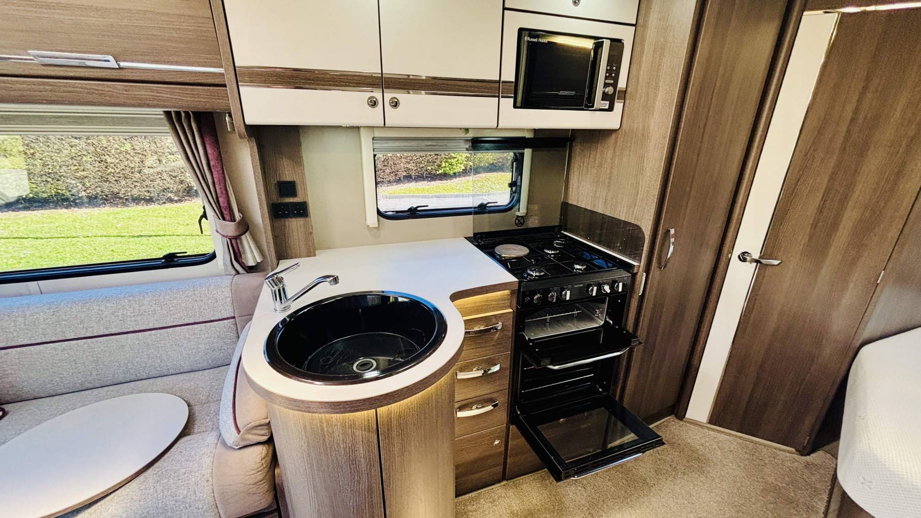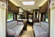 The central kitchen is very well equipped for touring, offering a full-size oven and separate grill, 3 gas and 1 electric ring hob, sink, large 3-way fridge freezer, microwave and generous worktop space, along with plenty of storage cupboards and drawers.