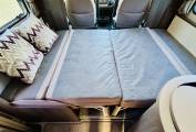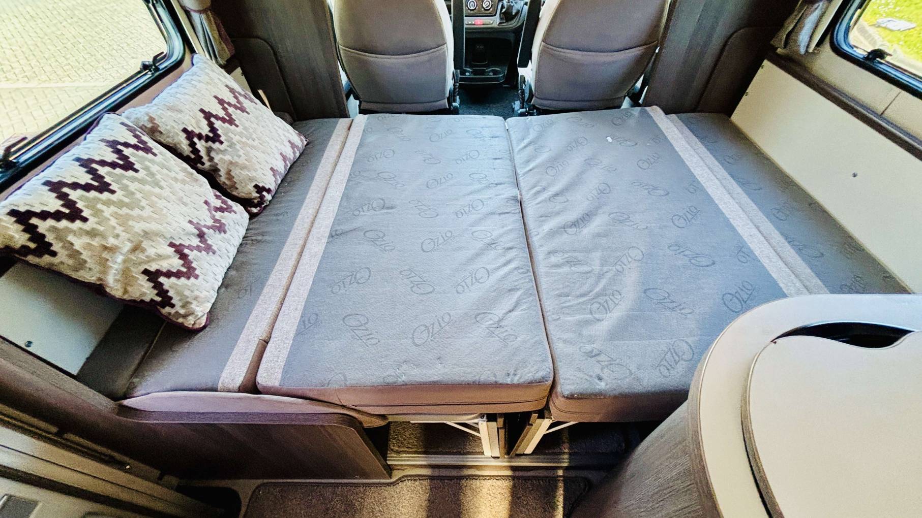 Towards the front, the lounge area is bright and spacious, with two side-facing sofas and a free-standing dining table. With the two captain’s seats swivelled, this creates a sociable space comfortably seating up to six people. In the evening, the lounge converts into a second double bed. There are also two concealed travel seats with three-point seatbelts neatly integrated beneath the side benches.