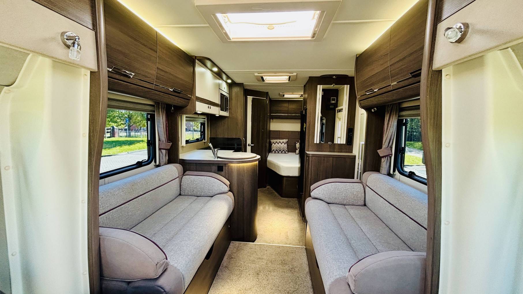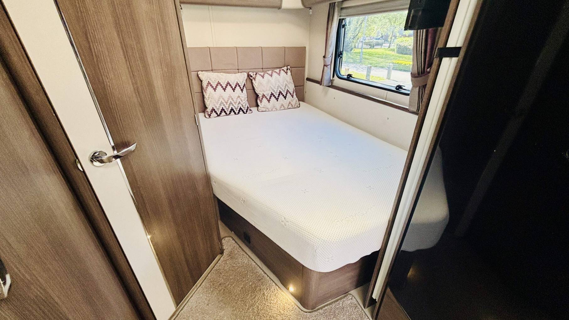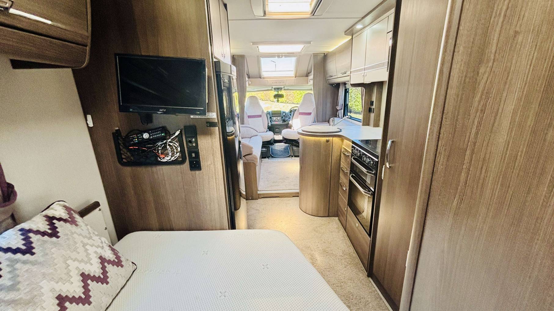 Specification is strong throughout, including Alde heating and hot water system, upgraded head unit with DAB, Sat Nav, Apple CarPlay and Android Auto, reversing camera, wind-out awning, solar panel, leisure battery, removable carpets, TV in the bedroom and an external SAT/TV point.