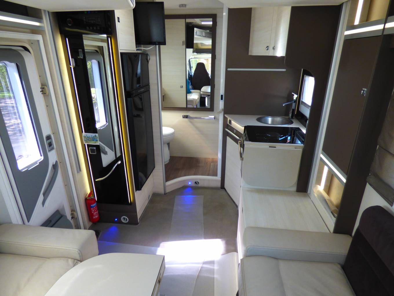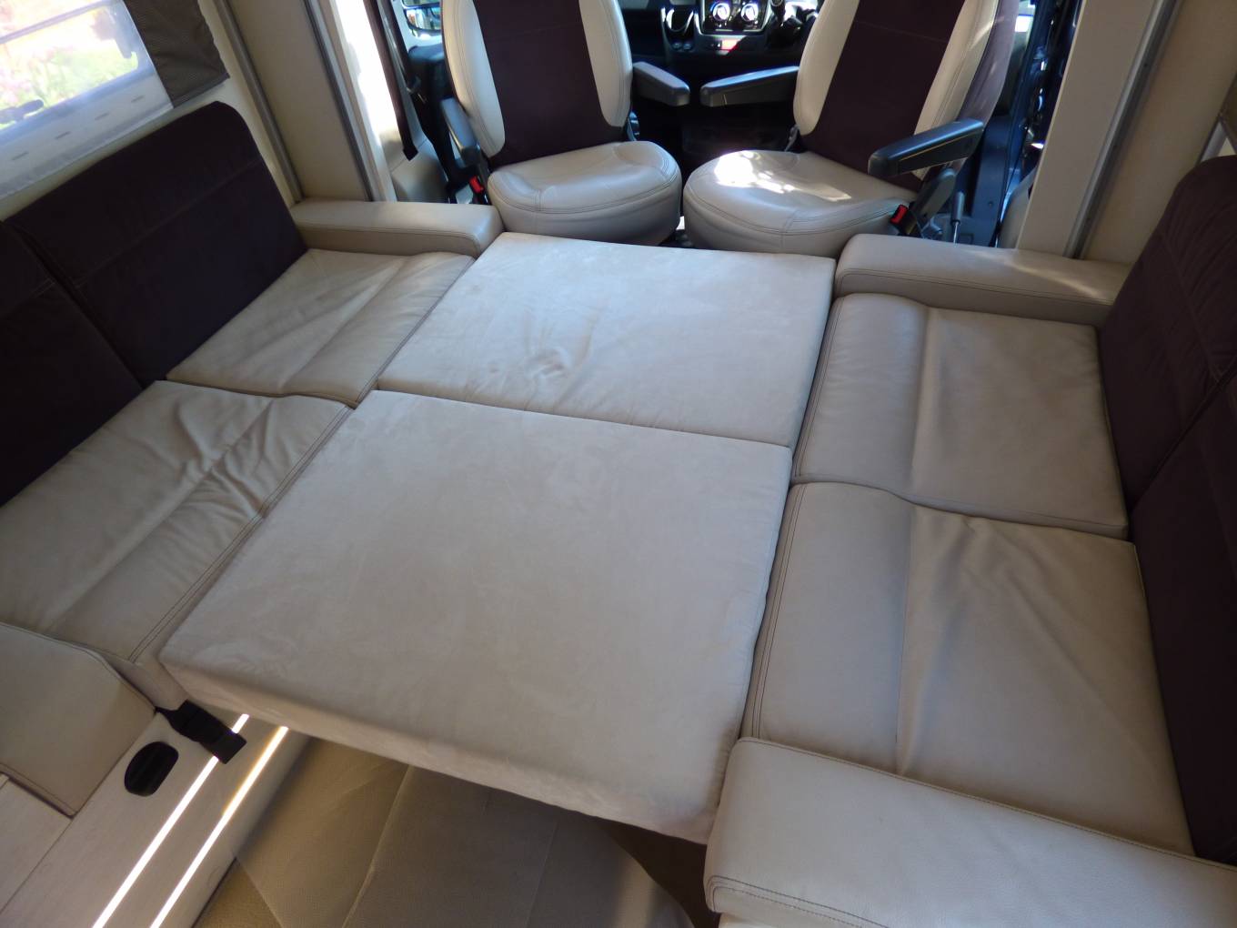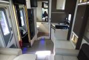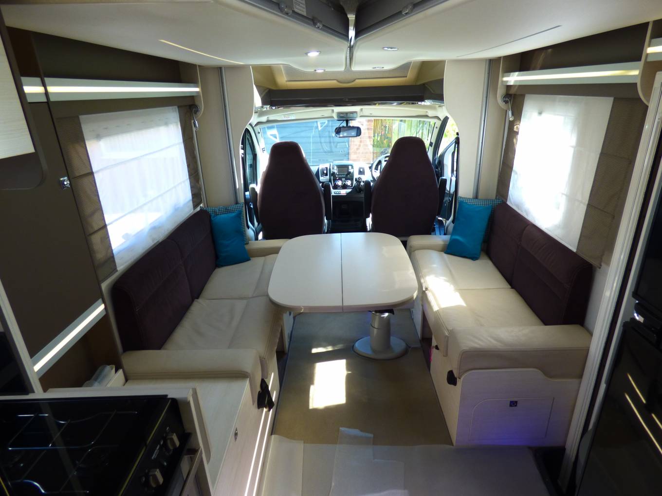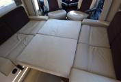 Next comes the dinette/lounge area with electric raise/lower folding table. Furnishings are in cream leather and fabric and with the two front seats turning to face the rest of the habitation space there is seating for around 6 people. Within the two bench seats are the two forward facing seats which can be raised to provide extra travelling seats. By lowering the table and using the two large extra cushions a double bed can be formed quickly and easily. Above this are are the two electrically lowered single beds which can be used in conjunction with the supplied ladder or lowered to allow easy access from the habitation floor.
