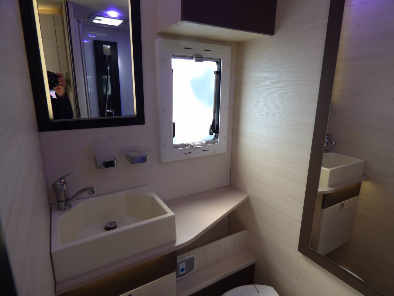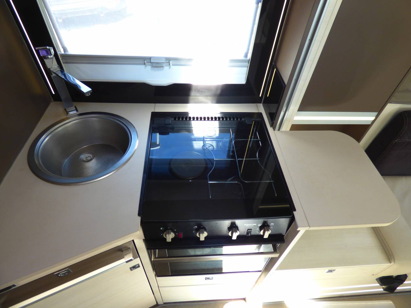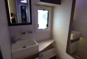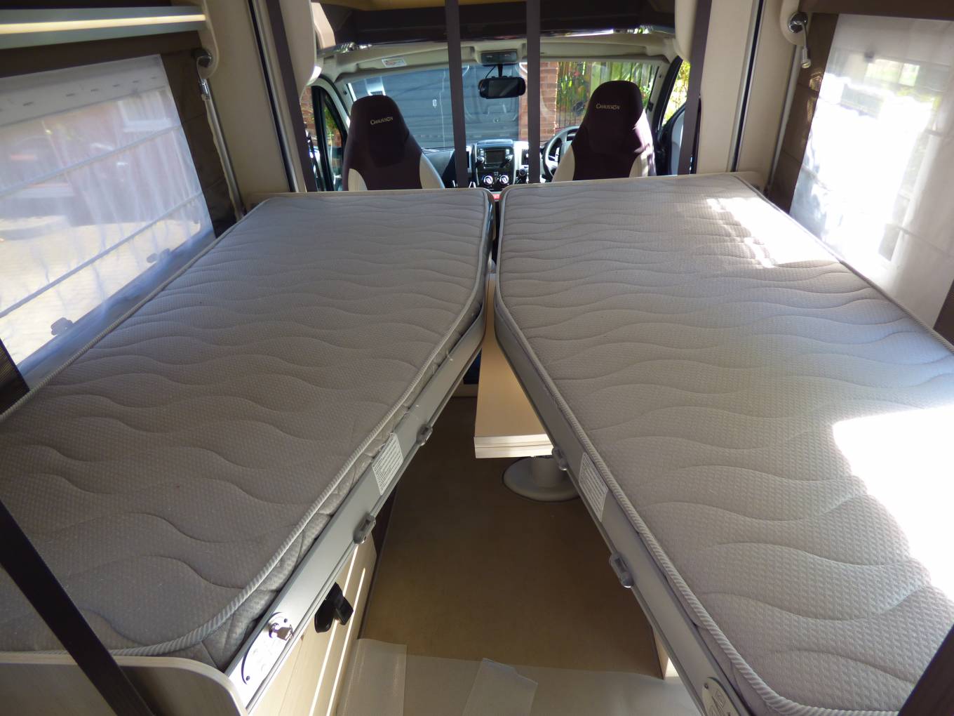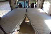 Next comes the dinette/lounge area with electric raise/lower folding table. Furnishings are in cream leather and fabric and with the two front seats turning to face the rest of the habitation space there is seating for around 6 people. Within the two bench seats are the two forward facing seats which can be raised to provide extra travelling seats. By lowering the table and using the two large extra cushions a double bed can be formed quickly and easily. Above this are are the two electrically lowered single beds which can be used in conjunction with the supplied ladder or lowered to allow easy access from the habitation floor.