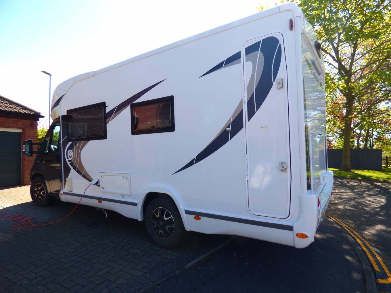 The cab has all the usual Fiat refinements with the 6 speed manual box coupled to the 2.3 litre Ducato engine, Remis style blinds provide total privacy in the cab and externally there is a large Fiamma awning, spare wheel, additional 240v socket and as previously mentioned the three doors to access the large garage.