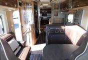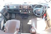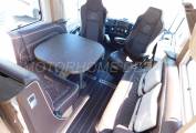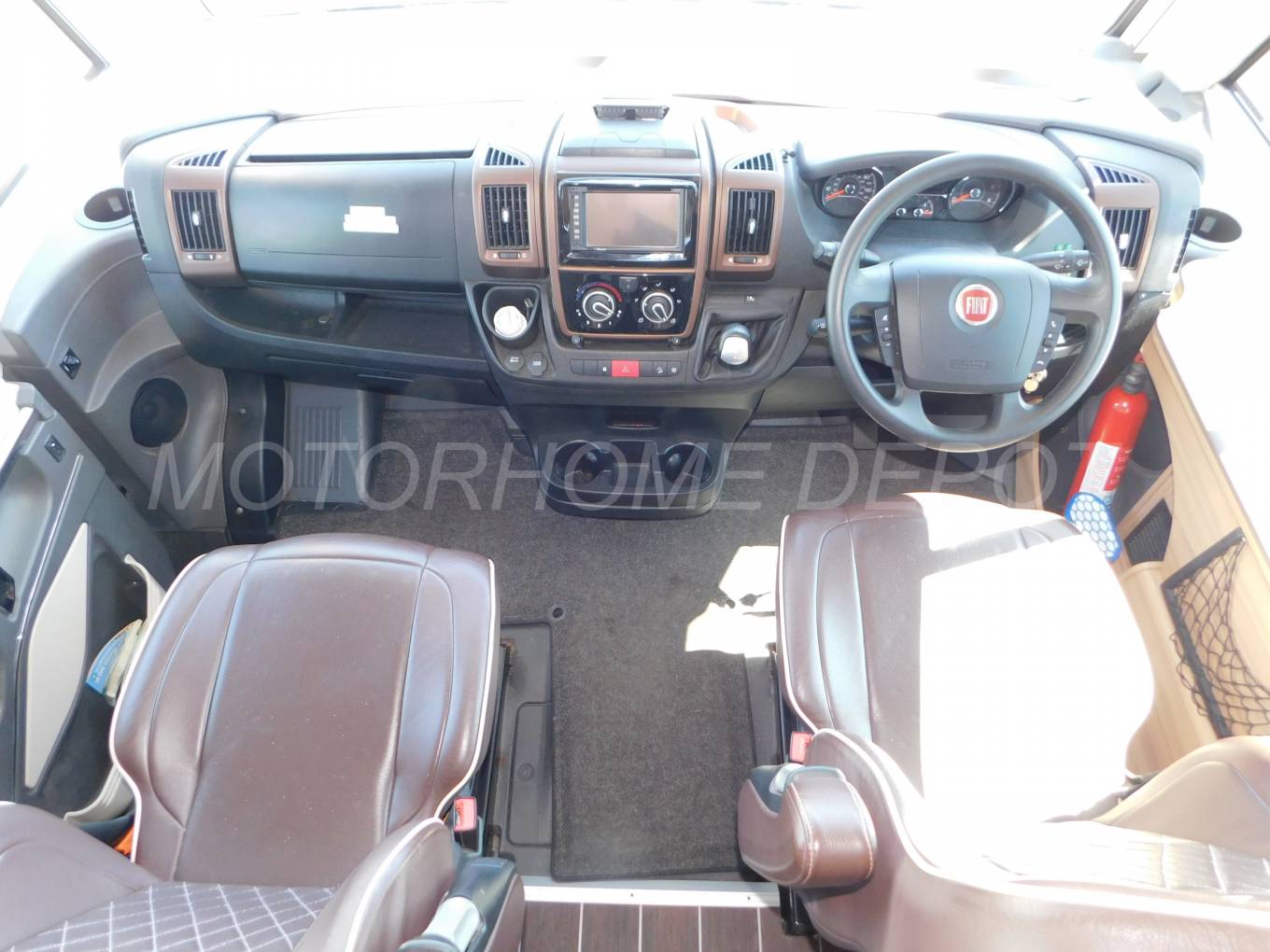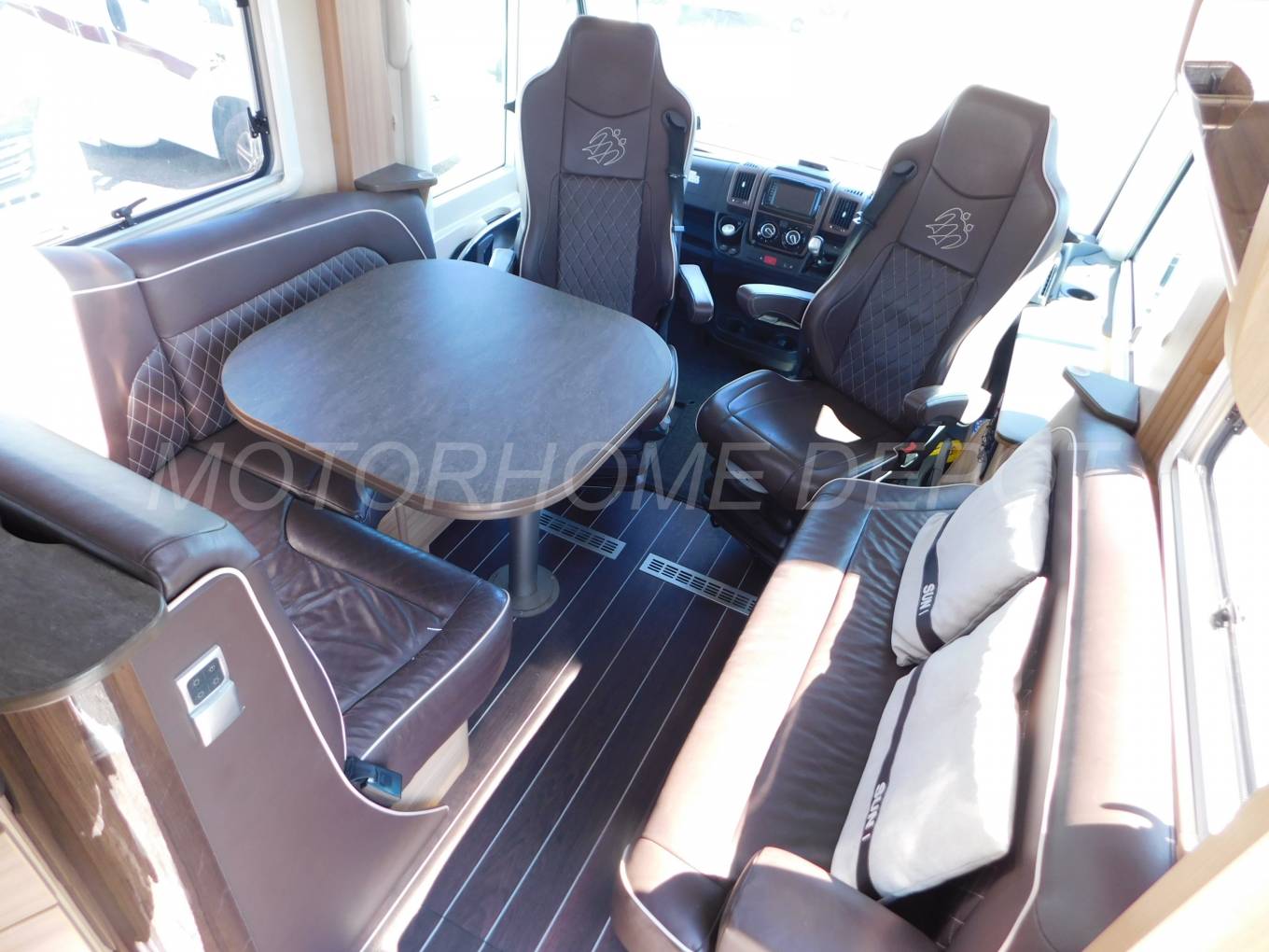 - Enter the van & the front lounge & dining area is to the right, large adjustable dining table, long l-shaped sofa & side seat. 2 forward facing seats have 3-point seatbelts, both front seats swivel, large sunroof, Truma Aventa air-con unit, upper lockers, plus a drinks/glass’s cabinet.