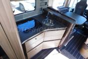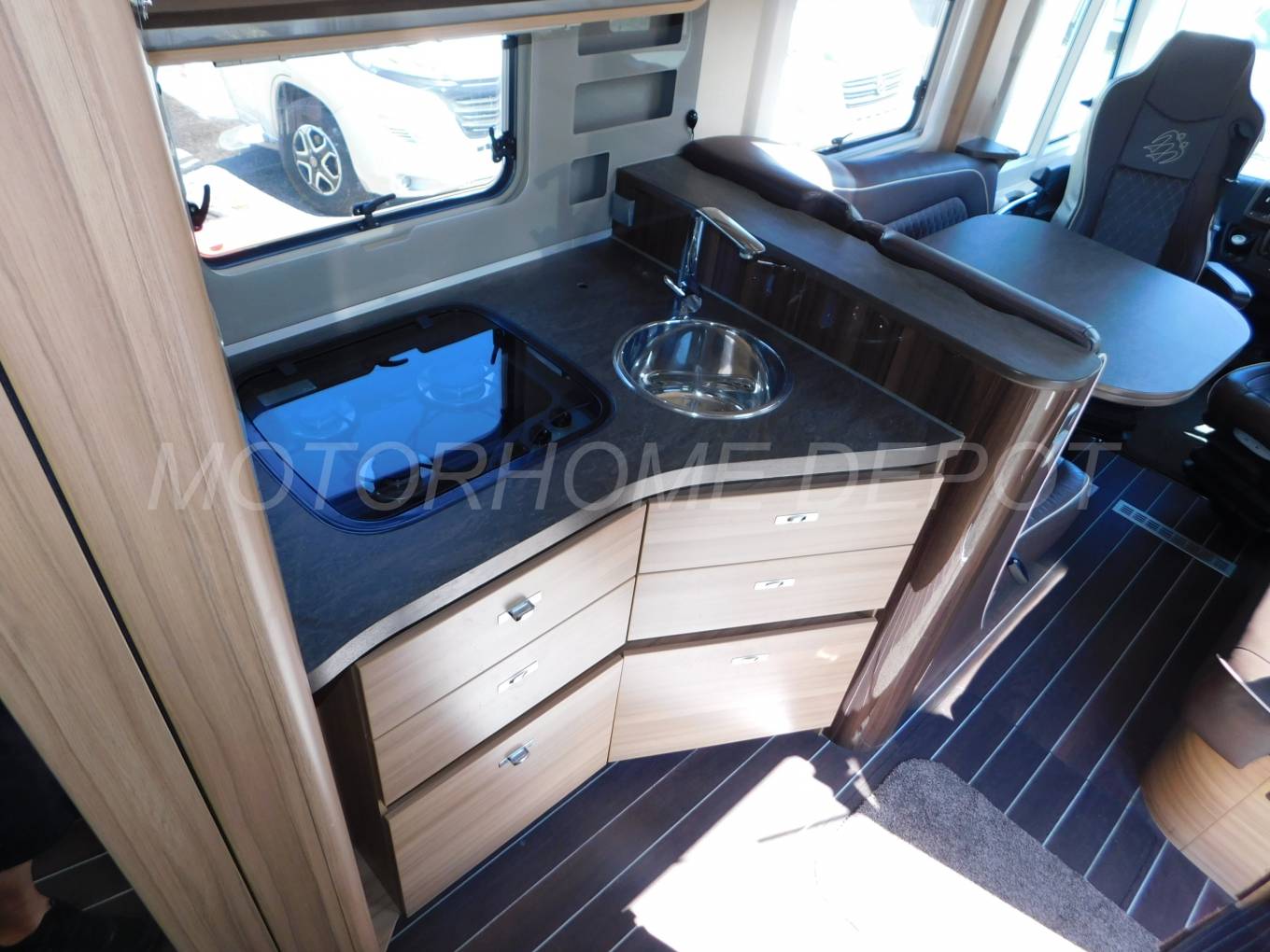- The Kitchen: Round stainless steel sink & chrome mixer tap, clever countertop waste bin, Thetford 3 gas burner hob & glass lid. Dometic full sized fridge with separate freezer - works on 12v, 240v & gas, Dometic gas oven/grill above (the door hinge is broken & needs replacing, the owner was going to remove it to put a more useful air fryer in place), plus cupboards, drawers & clever slide-out unit to store your touring provisions.