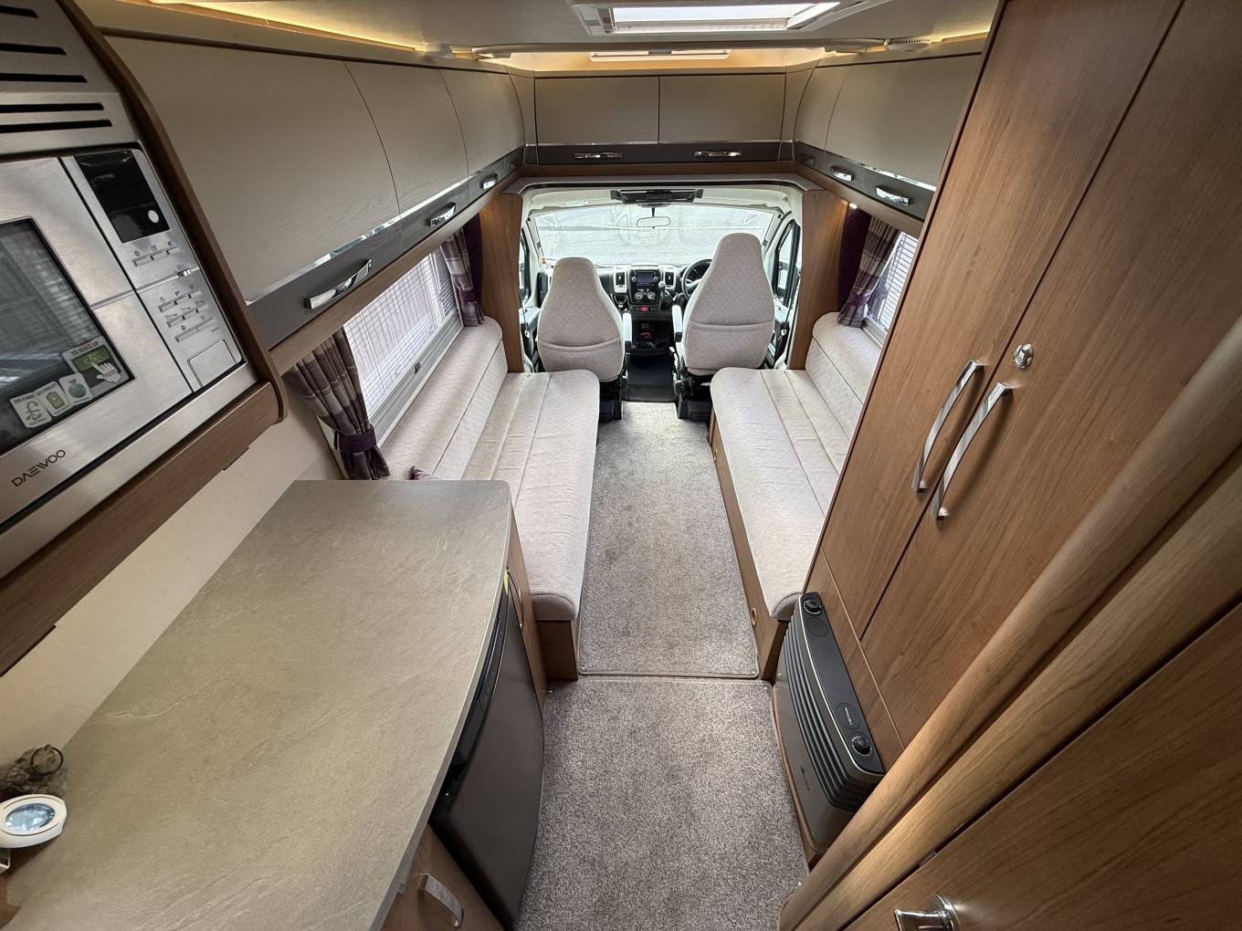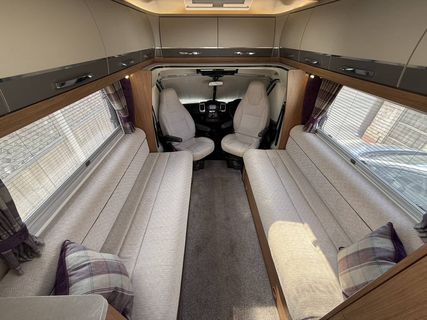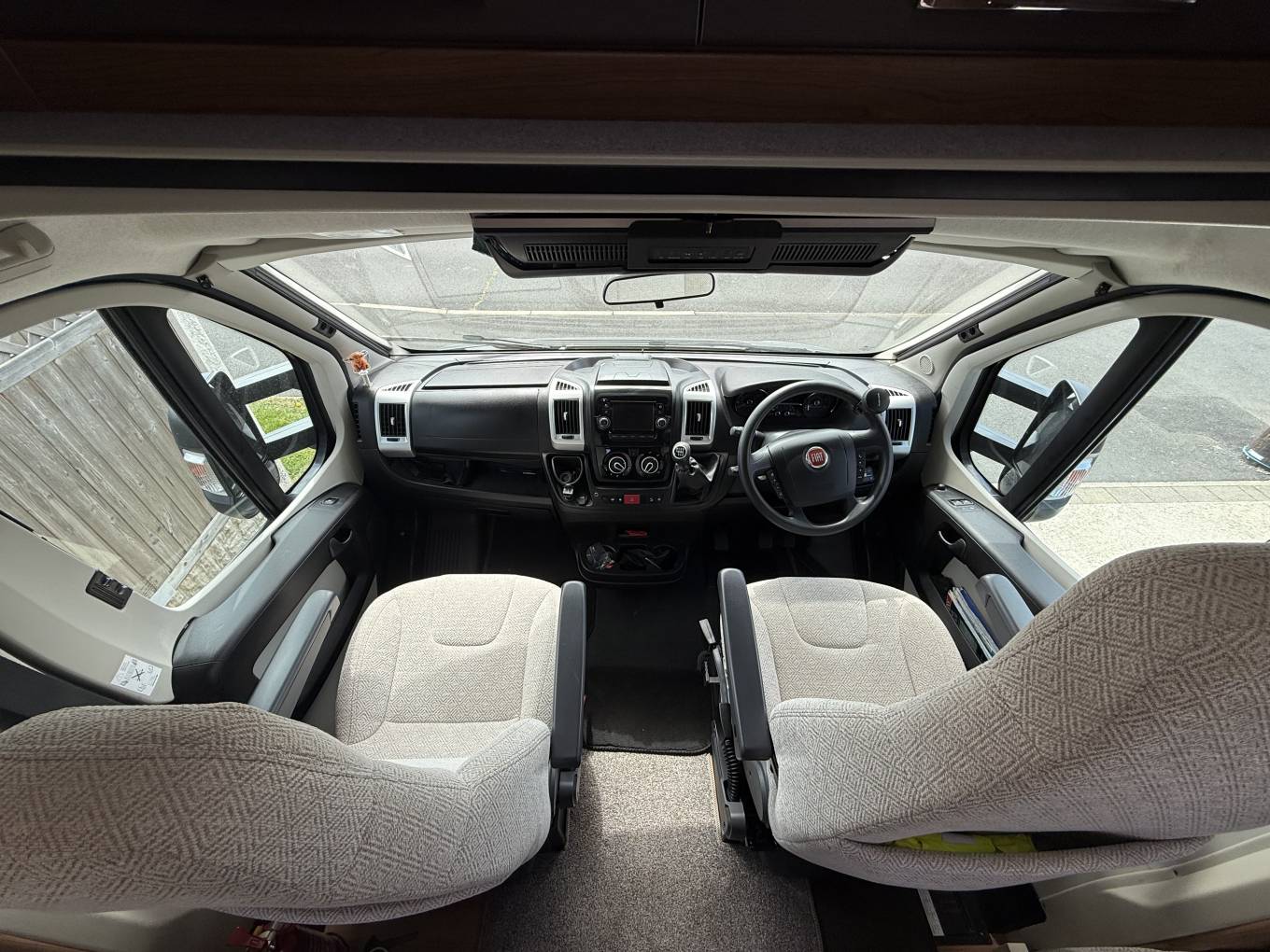 Heating and hot water are supplied by a Truma system, making this motorhome suitable for year-round use, while the swivel captain’s chairs enhance the living space and add to the overall versatility. Storage has been cleverly considered throughout, allowing you to bring everything you need without feeling cramped.