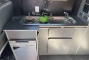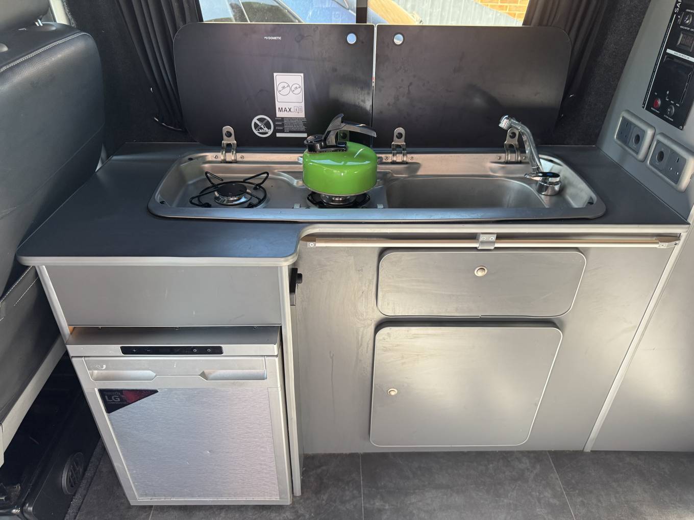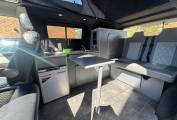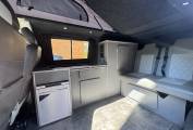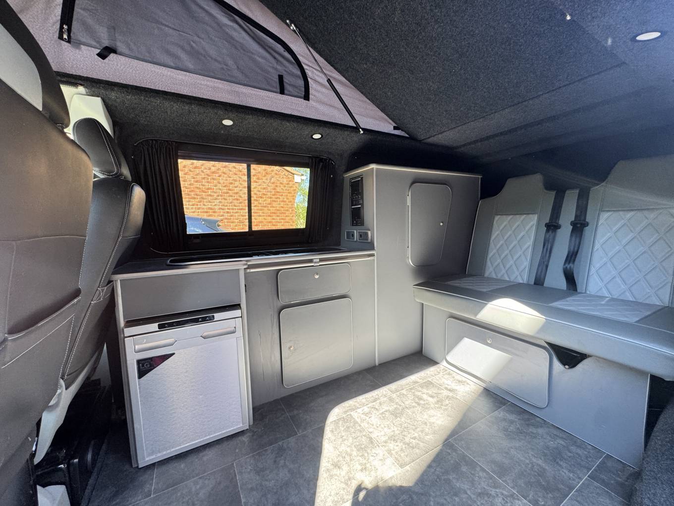 Along the side is a well-equipped kitchen unit with sink, hob, fridge, and storage cupboards, all finished in a modern, clean style. The pop-top roof provides a second sleeping area, making this a flexible setup for a range of uses. Curtains and interior lighting ensure the space remains practical and comfortable throughout.