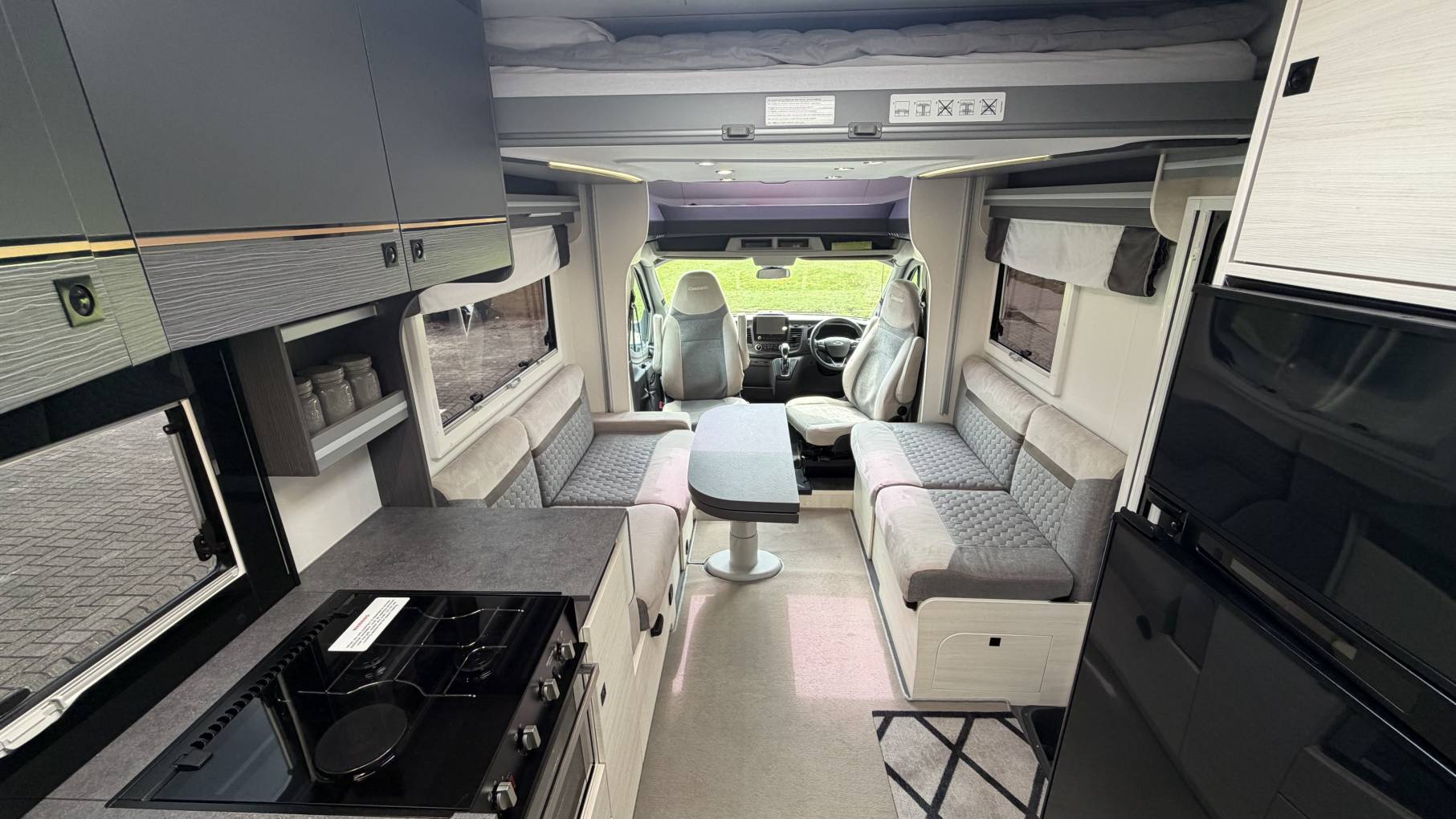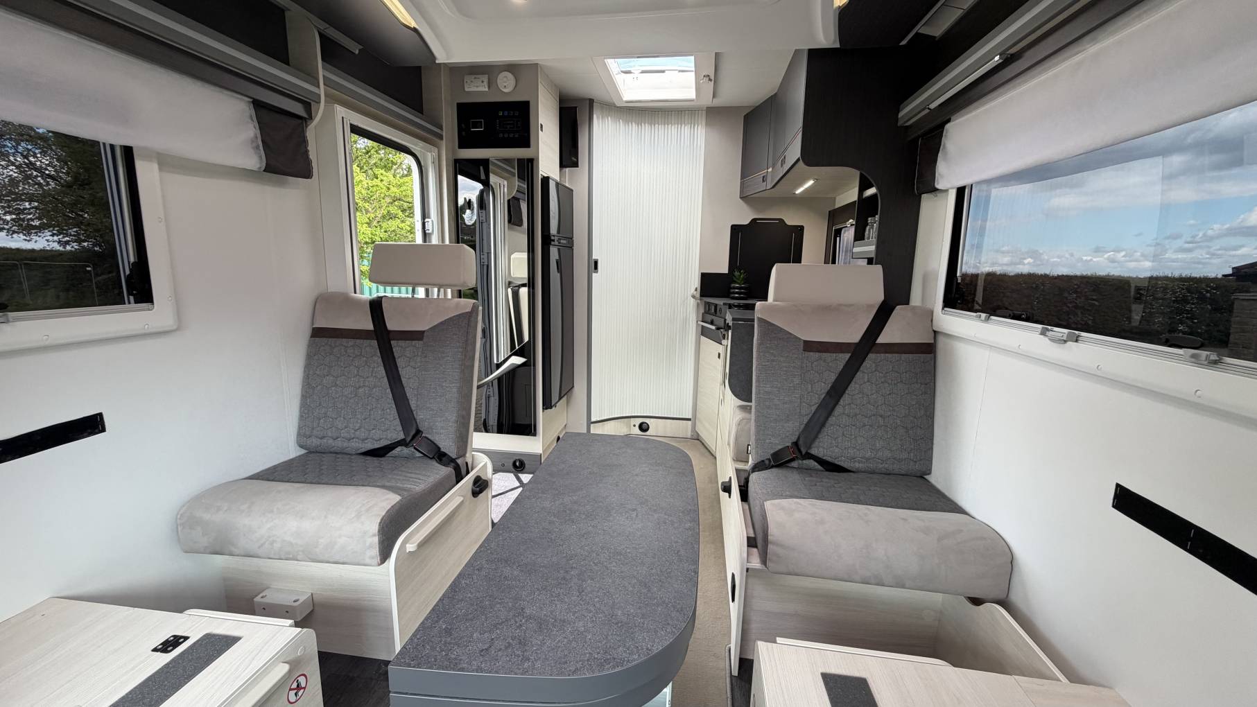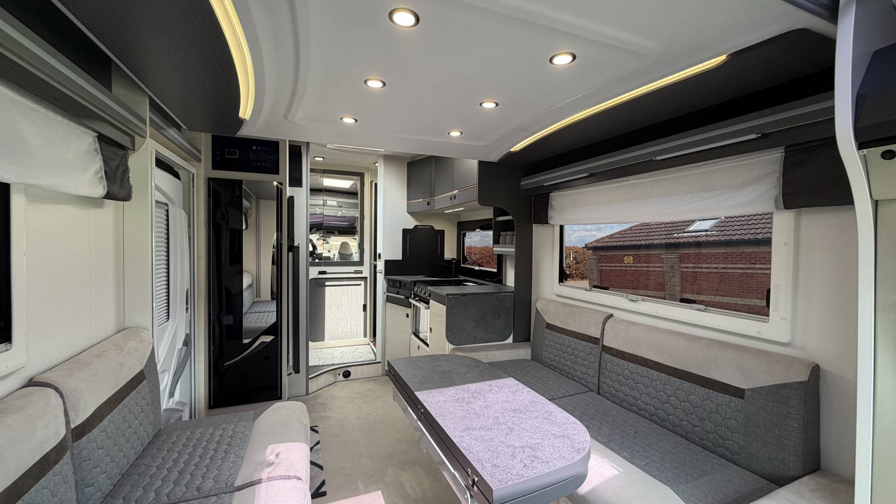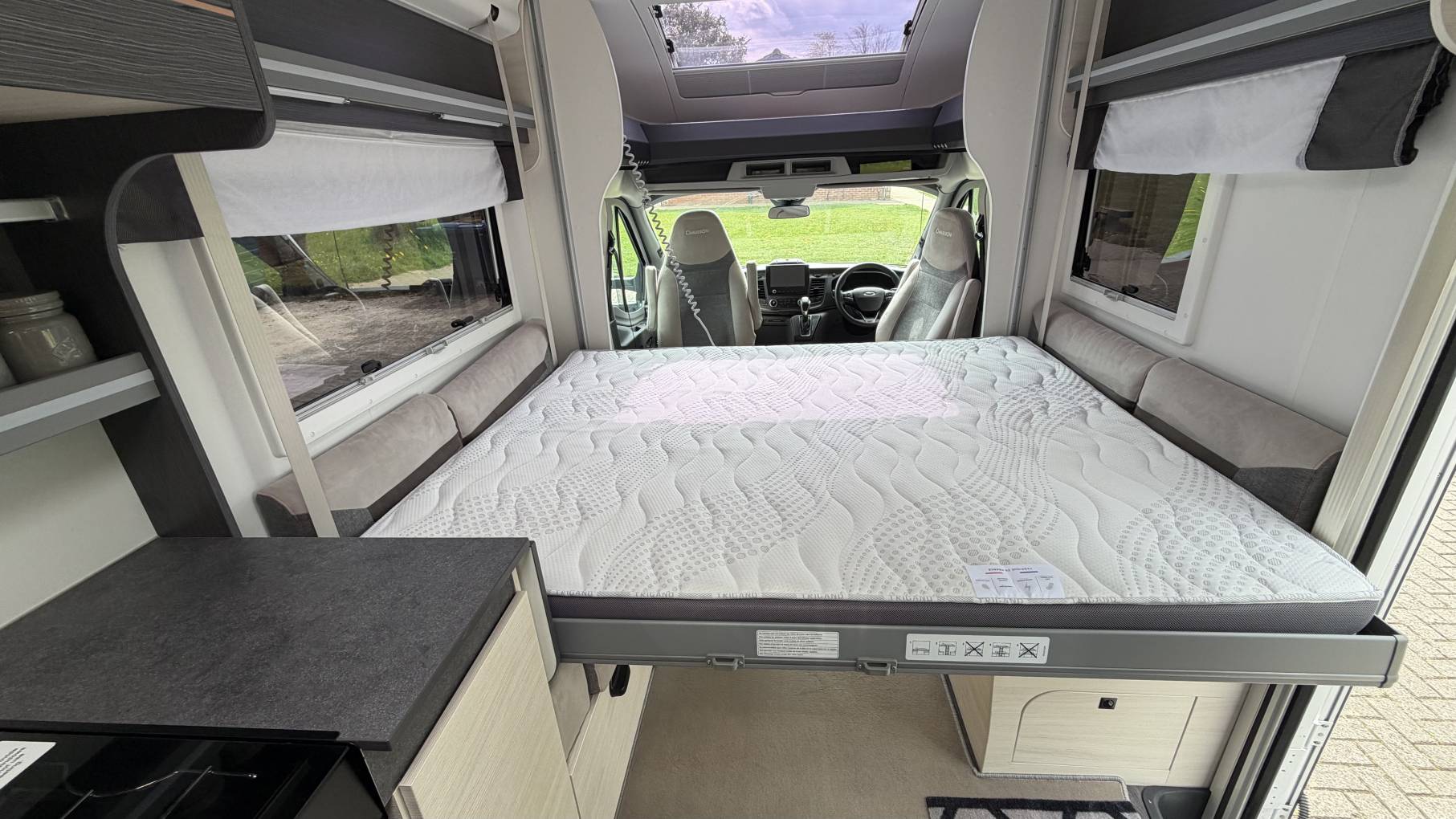 The two long bench sofas easily convert into two forward-facing, seat-belted seats, making it a breeze to bring along friends or family. And when it’s time to relax, the large drop-down double bed with a premium quality mattress measuring a massive 6` 3″ x 5` 3″ (1900 mm x 1600 mm), ensures a restful night’s sleep, The drop-down bed can be used `at height` like a large bunk-bed arrangement, or alternatively if you have no passengers sleeping below, the bed can be lowered all the way down, sitting just off the lounge cushions beneath. The kitchen is well equipped with a cooker featuring an electric hot plate and 2 x gas burners, and a Thetford grill / oven .and there’s a useful extendable work surface and opposite there is a large fridge and separate Freezer including Automatic Energy Selection feature. It is designed with your convenience in mind. The full-width rear washroom offers a separate shower cubicle, WC, and a spacious wardrobe. The massive rear garage, accessible from both sides and even from inside the motorhome, provides ample storage for all you gear. The heating system is a blown-air diesel powered Webasto heater, and the hot water comes from a Truma Ultrastore system which is mains electrically powered or by gas. Fresh water capacity is a massive 105 Litres and the waste just a little less at 100 Litres. Radio with Bluetooth connectivity with a built-in reversing camera. Externally it has a wind out canopy, Bbq point and shower point. Carbon fibre wing mirrors, tinted windows, Gaslow refillable bottle, paint seal protection, bra bonnet and alloy wheels. This motorhome can be viewed in Rotherham by appointment only, part exchange and finance is available.