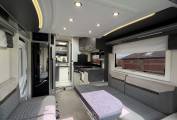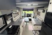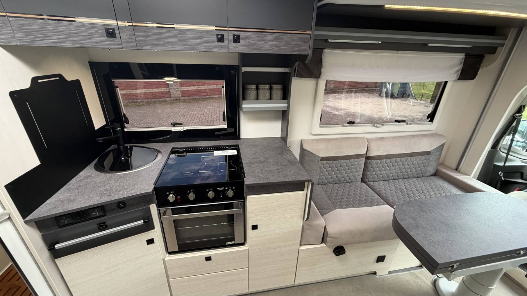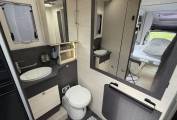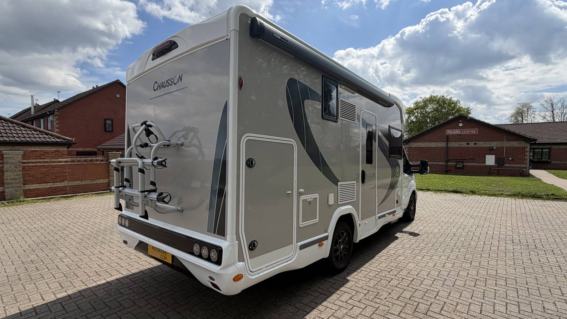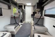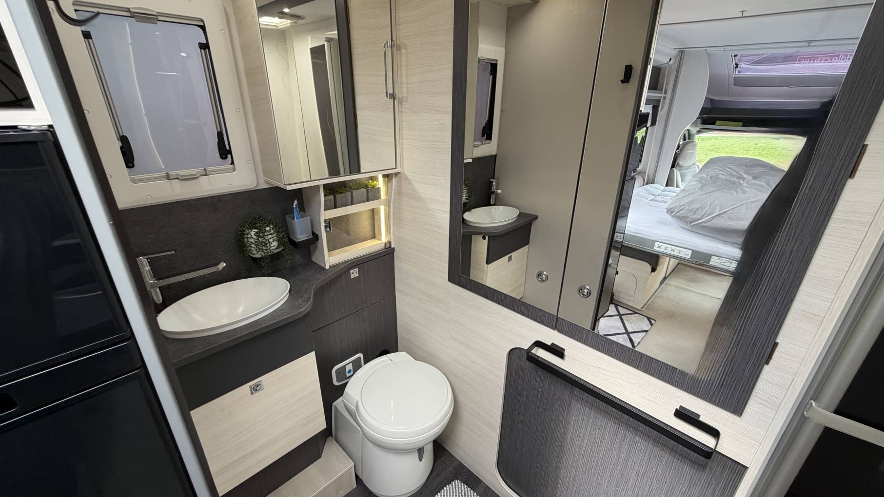 The two long bench sofas easily convert into two forward-facing, seat-belted seats, making it a breeze to bring along friends or family. And when it’s time to relax, the large drop-down double bed with a premium quality mattress measuring a massive 6` 3″ x 5` 3″ (1900 mm x 1600 mm), ensures a restful night’s sleep, The drop-down bed can be used `at height` like a large bunk-bed arrangement, or alternatively if you have no passengers sleeping below, the bed can be lowered all the way down, sitting just off the lounge cushions beneath. The kitchen is well equipped with a cooker featuring an electric hot plate and 2 x gas burners, and a Thetford grill / oven .and there’s a useful extendable work surface and opposite there is a large fridge and separate Freezer including Automatic Energy Selection feature. It is designed with your convenience in mind. The full-width rear washroom offers a separate shower cubicle, WC, and a spacious wardrobe. The massive rear garage, accessible from both sides and even from inside the motorhome, provides ample storage for all you gear. The heating system is a blown-air diesel powered Webasto heater, and the hot water comes from a Truma Ultrastore system which is mains electrically powered or by gas. Fresh water capacity is a massive 105 Litres and the waste just a little less at 100 Litres. Radio with Bluetooth connectivity with a built-in reversing camera. Externally it has a wind out canopy, Bbq point and shower point. Carbon fibre wing mirrors, tinted windows, Gaslow refillable bottle, paint seal protection, bra bonnet and alloy wheels. This motorhome can be viewed in Rotherham by appointment only, part exchange and finance is available.