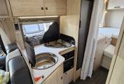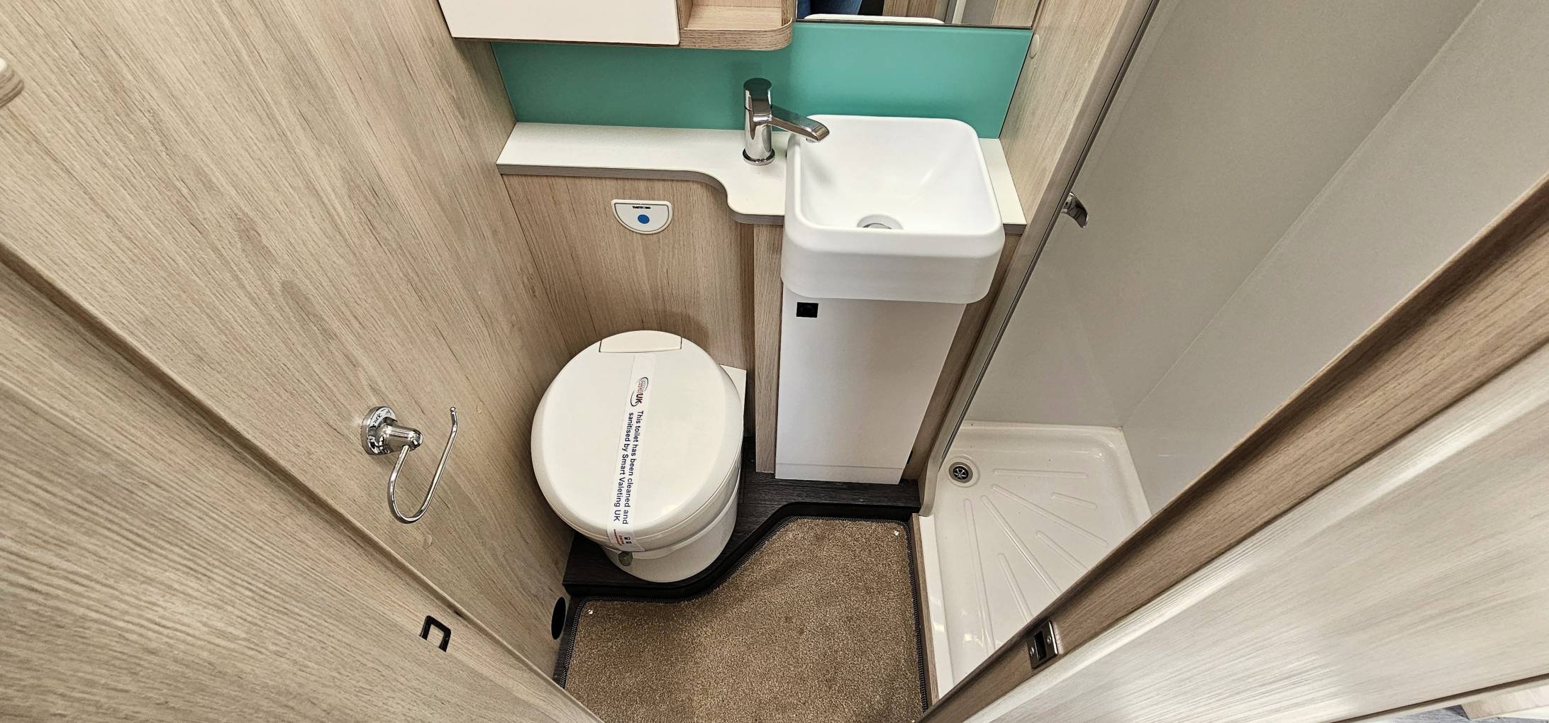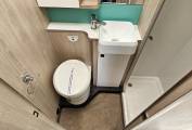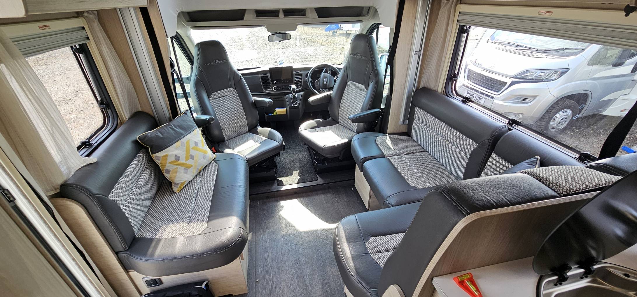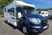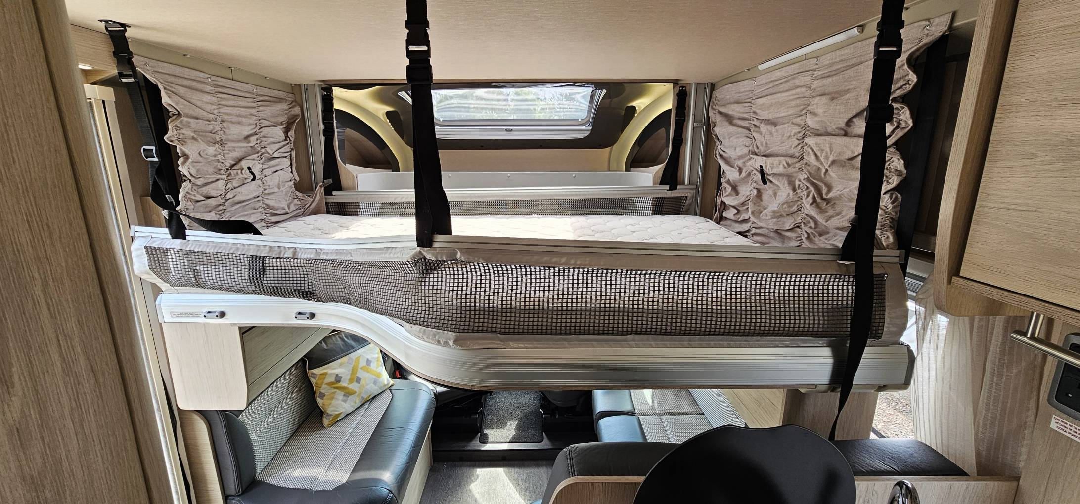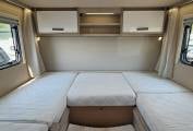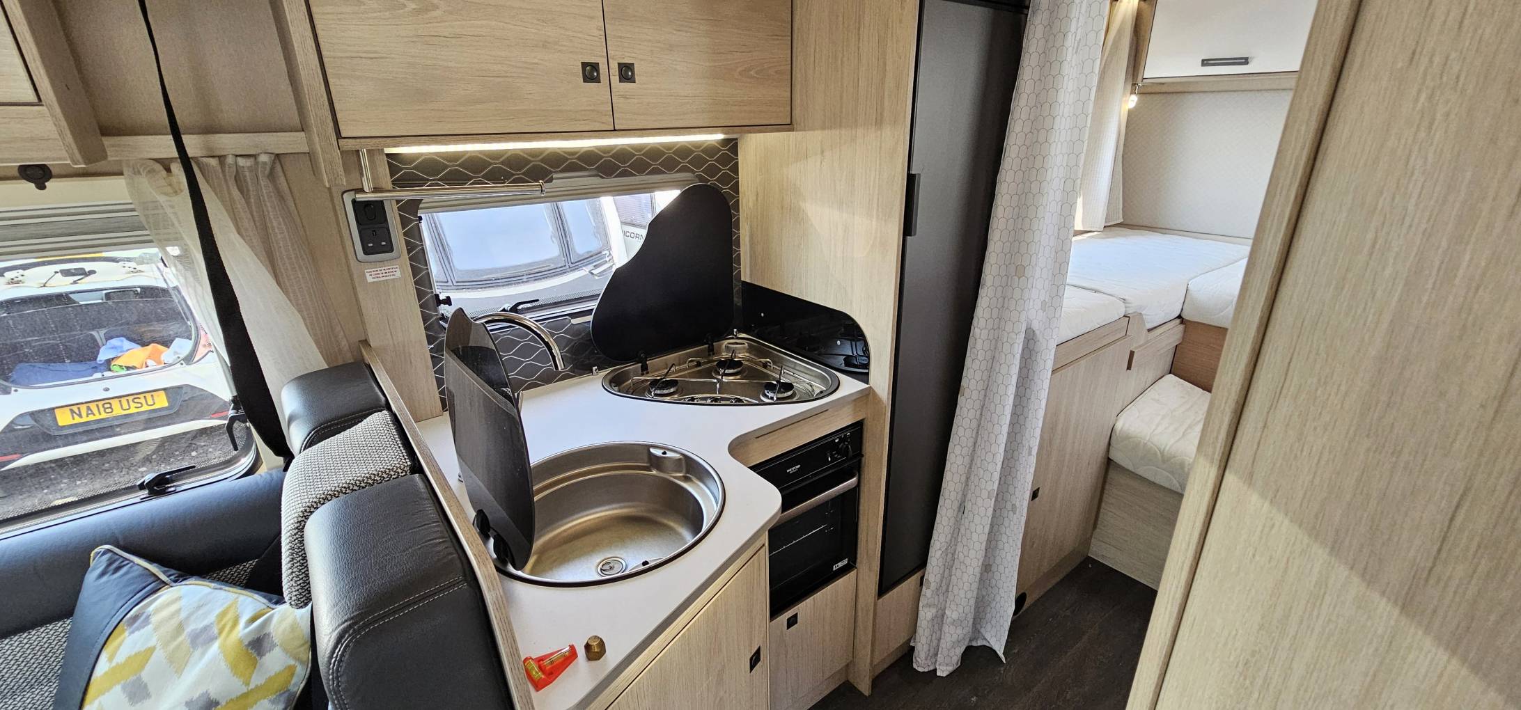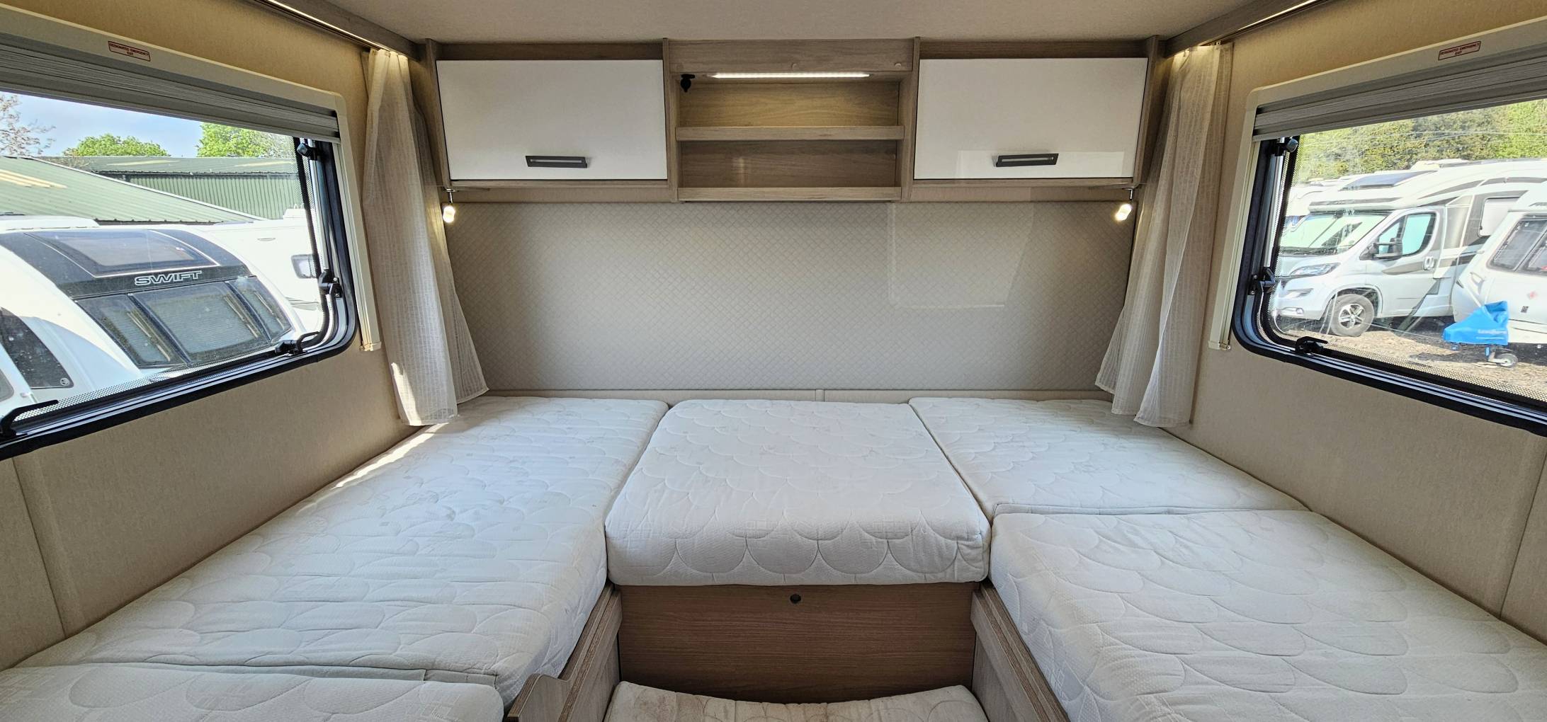 Offering a practical four berth layout with four travelling seatbelts, the F70 features an electric drop-down double bed to the front, with twin single beds to the rear which can be converted into a large double if required. The central living space provides a well laid out dinette area alongside a kitchen and washroom, making it a comfortable setup for both short trips and longer stays.