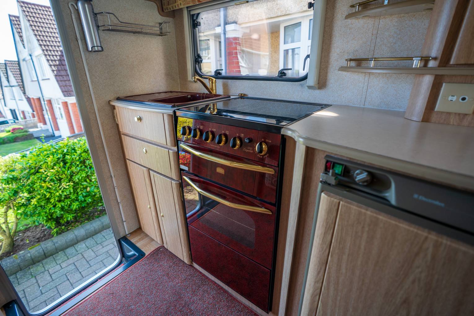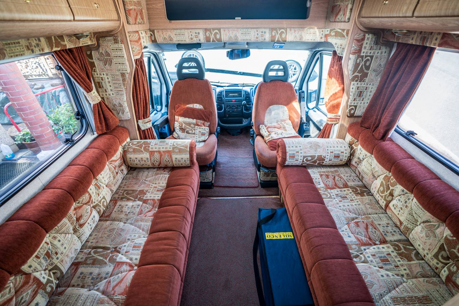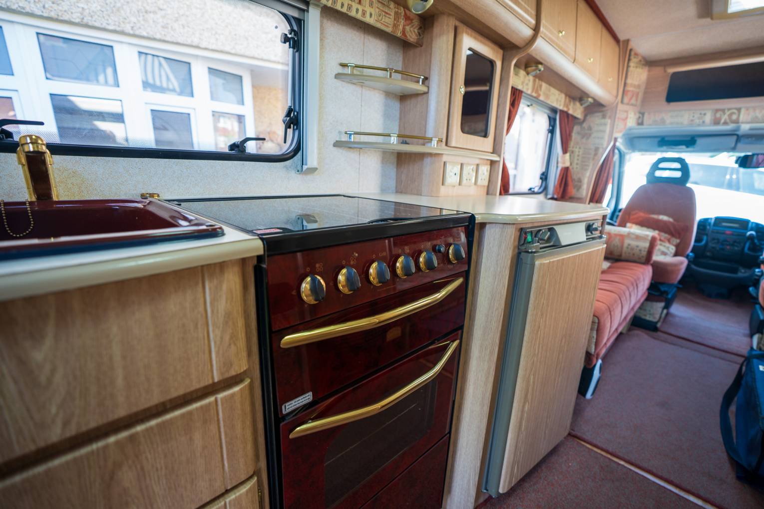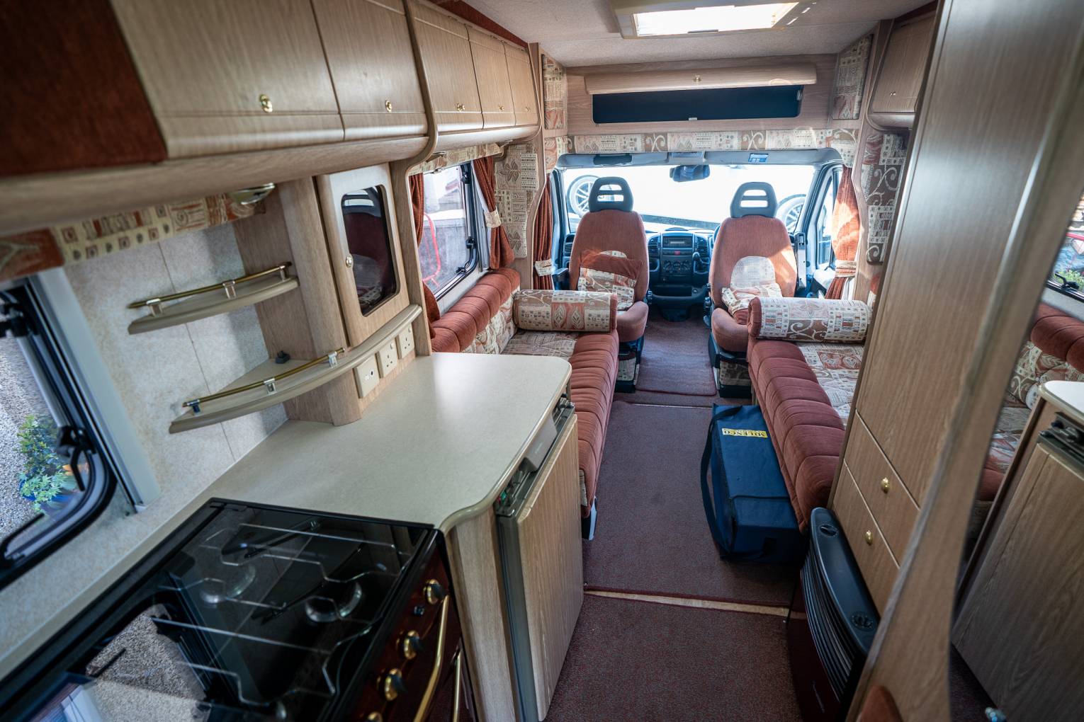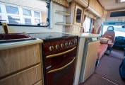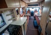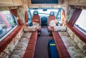 Style | Alongside the unique burgundy Kitchen styling - The Rear opening Habitation door is a rarity in the motorhoming world, and offers a retro solution to a modern problem. Enabling you to not only stand out from the crowd, but reverse park on those beauty spots, open the rear door, and just watch the world go by - a Luxury previously reserved for Campervans only. The internal layout does its best to maximise this too, by putting all the ablutions and kitchen at the rear, to vent any cooking fragrances. The internal decor stands out as appeasing both modern and retro enthusiast alike- with the two toned pattern upholstery and light Oak Effect Furnishings, are a timeless addition to the living area.