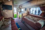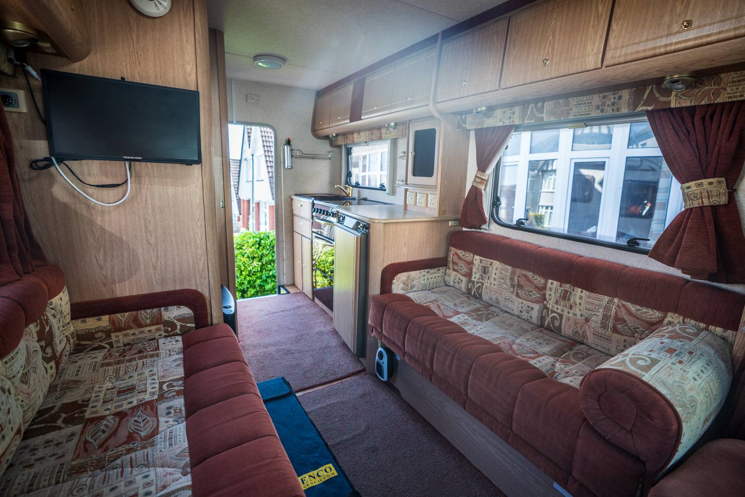 Comfort | For such a compact vehicle, this legendary Valentine uses space in all the right places. The Bathroom comes fully fitted with a vanity sink, shower and Thetford Toilet. Opposite is the fully fitted kitchen with deluxe Oven/Grill unit and sink area, all in complimentary burgundy styling. Whilst there is plenty of worktop space and overhead storage throughout. At the centre of the vehicle - the opposing benches provide ample seating during the day. Whilst at night they can be turned into two singles (extendable by rotating the front seats) - or a Large motorhome wide double bed. All of this is in view of the fitted flat screen TV - so you don't have to miss any of your favourite shows whilst away