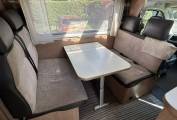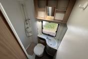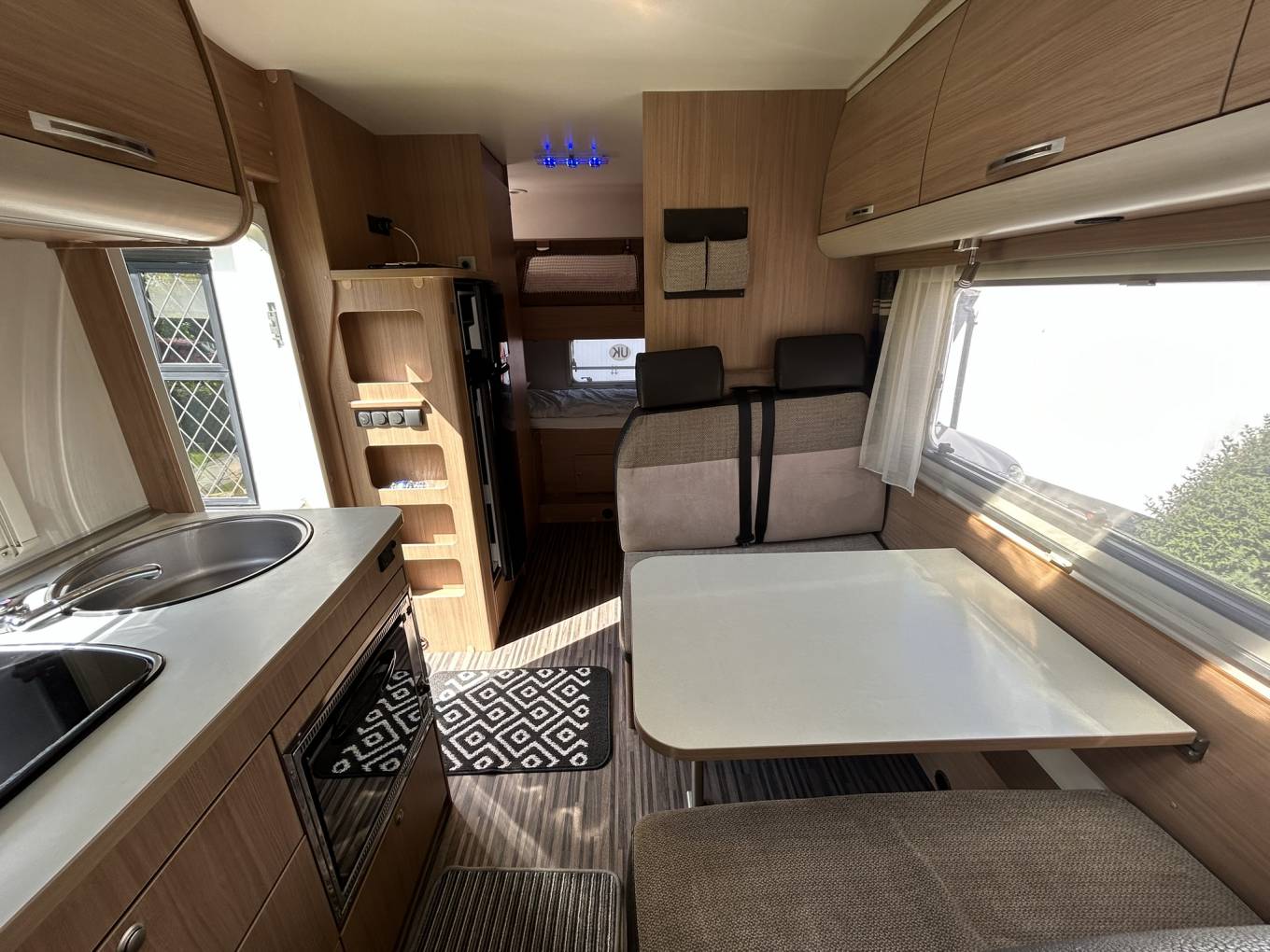 Inside, the layout is designed with practicality in mind, offering comfortable sleeping for up to six people, making it perfect for family trips or travelling with friends. The living area provides a welcoming space to relax and dine, while the kitchen is well equipped for life on the road, featuring a large 150L fridge freezer.