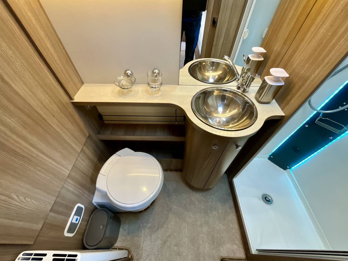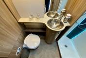 The washroom at the back features a separate shower cubicle, wardrobe and Thetford toilet with cassette and SOG unit.