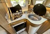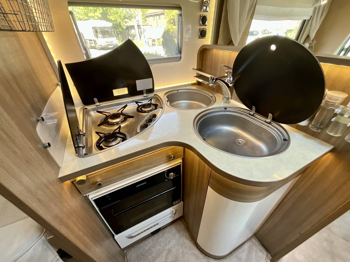 The kitchen is equipped with a huge 177litre Dometic fridge, gas hobs, Baraldi extractor fan, oven/grill and plenty of storage.