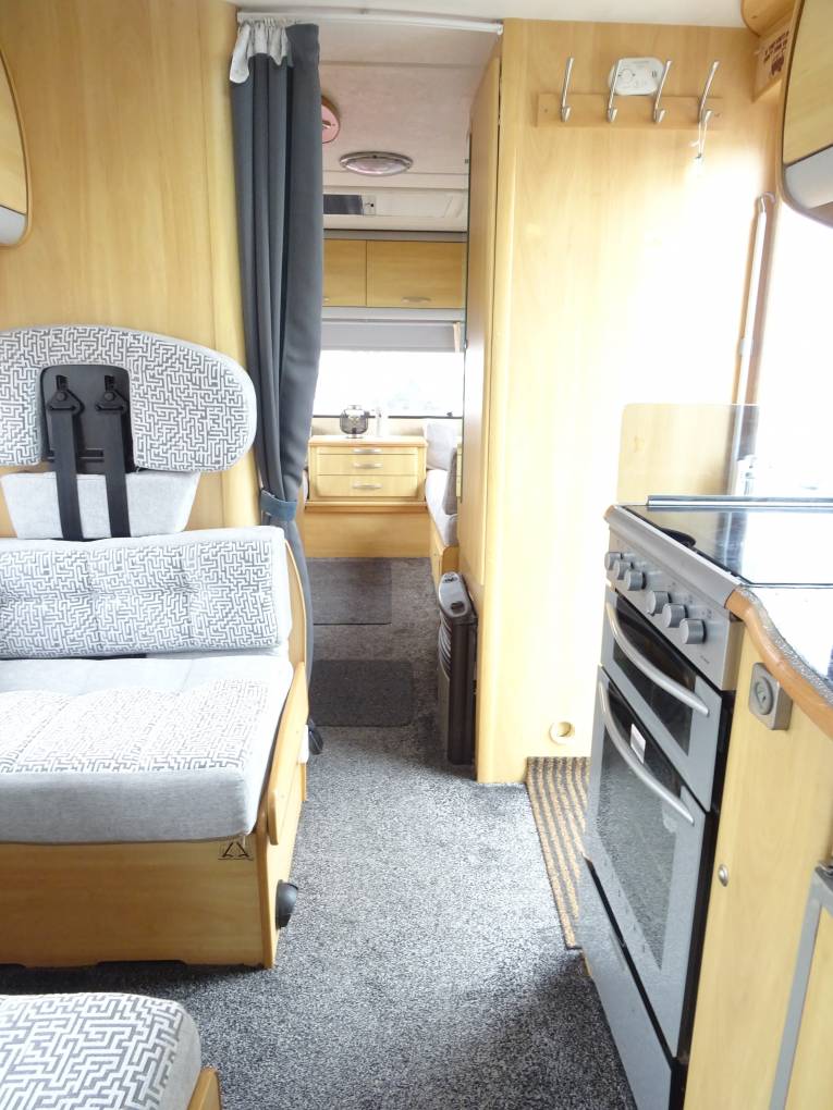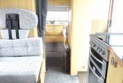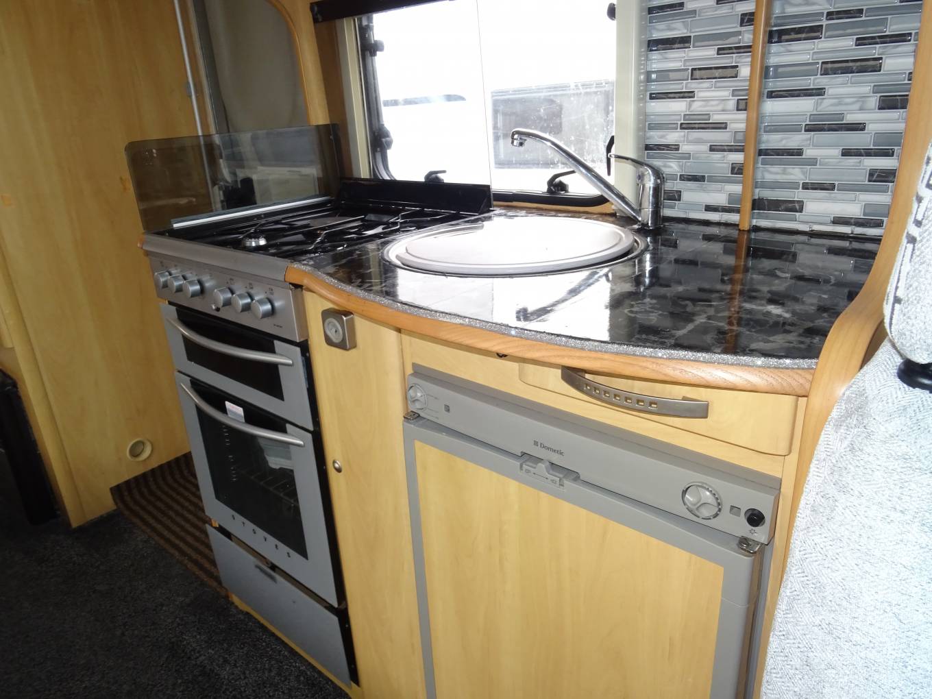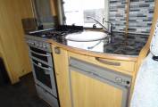 Moving forward, you find a corridor between the front & rear habitat sections, which contains a large double door wardrobe, opposite which is a large shower/wet room with a swivelling W.C. Forward still further you will find the comprehensive kitchen area which incorporates a four burner gas hob, underneath which you will find a full size grill & a separate oven, Also there is a stainless steel sink with detachable draining area, mixer tap & chopping board cover, below this is a fridge with freezer box.