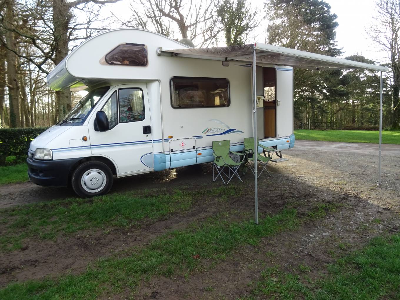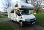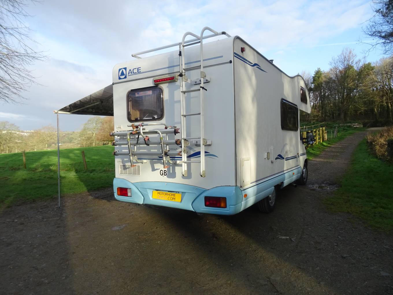 For sale - Ace Novella Milano 2.3L Fiat Ducato Manual Diesel 3400kg 5 speed gearbox motorhome with a recent Habcheck, new tyres fitted, only 51036 miles on the clock and 4 travelling seat belts.. The Ace can accomodate five people with an over-cab double bed and dining seats that convert to a good size double, and a large single bed. This family motorhome has an end kitchen with a 4-ring gas hob, a seperate grill and oven, a single bowl sink with mixer tap and a Dometic Fridge with a freezer compartment. The washroom is also located at the rear of the vehicle and has been fitted with a round wash basin, a Thetford swivel toilet and a shower. There are plenty of overhead lockers for storage as well as low level and cupboard space for your clothes and essentials when away. The large wardrobe also houses the fold away rail mounted table, which can accomodate four diners when deployed. We also have the benefit of gas and electric Trumatic blown-air heating and a cab area that has electric windows and mirrors and a radio/cd player with usb connection. Other features of this ideal family motorhome include 200w solar with two leisure batteries, a bike rack capable of carrying 3 bikes, a roof ladder and a bracket mounted TV. This is a great affordable motorhome with lots to offer, ideal for a small family.