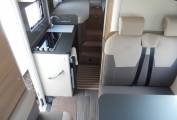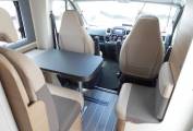 The dinette consists of a forward facing 2 seater sofa with 2 belted seats and a side facing chair which cleverly swings forward to give access to a cupboard behind it. There is also some storage space under the seats. This is a motorhome that has been designed to maximise every square inch available. The dinette makes in to a single bed at night time if required. The cab benefits from 2 swivel seats, a multi-media system, air conditioning, electric windows and mirrors, a 2 way reversing camera, ABS brakes and cruise control. Built on the excellent Fiat Ducato chassis, this motorhome has a manual 6 speed gearbox and 2.3 litre engine.