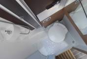 Exiting the bedroom, on the right you have the kitchen which has a 3 gas burner hob, a 102 litre Dometic fridge freezer, a sink with mixer tap and lovely soft close drawers in an attractive warm brown finish. Opposite is the stunning bathroom which has a shower with screen, a cassette toilet, a wash basin and mixer tap, a large cupboard and a good size mirror.
