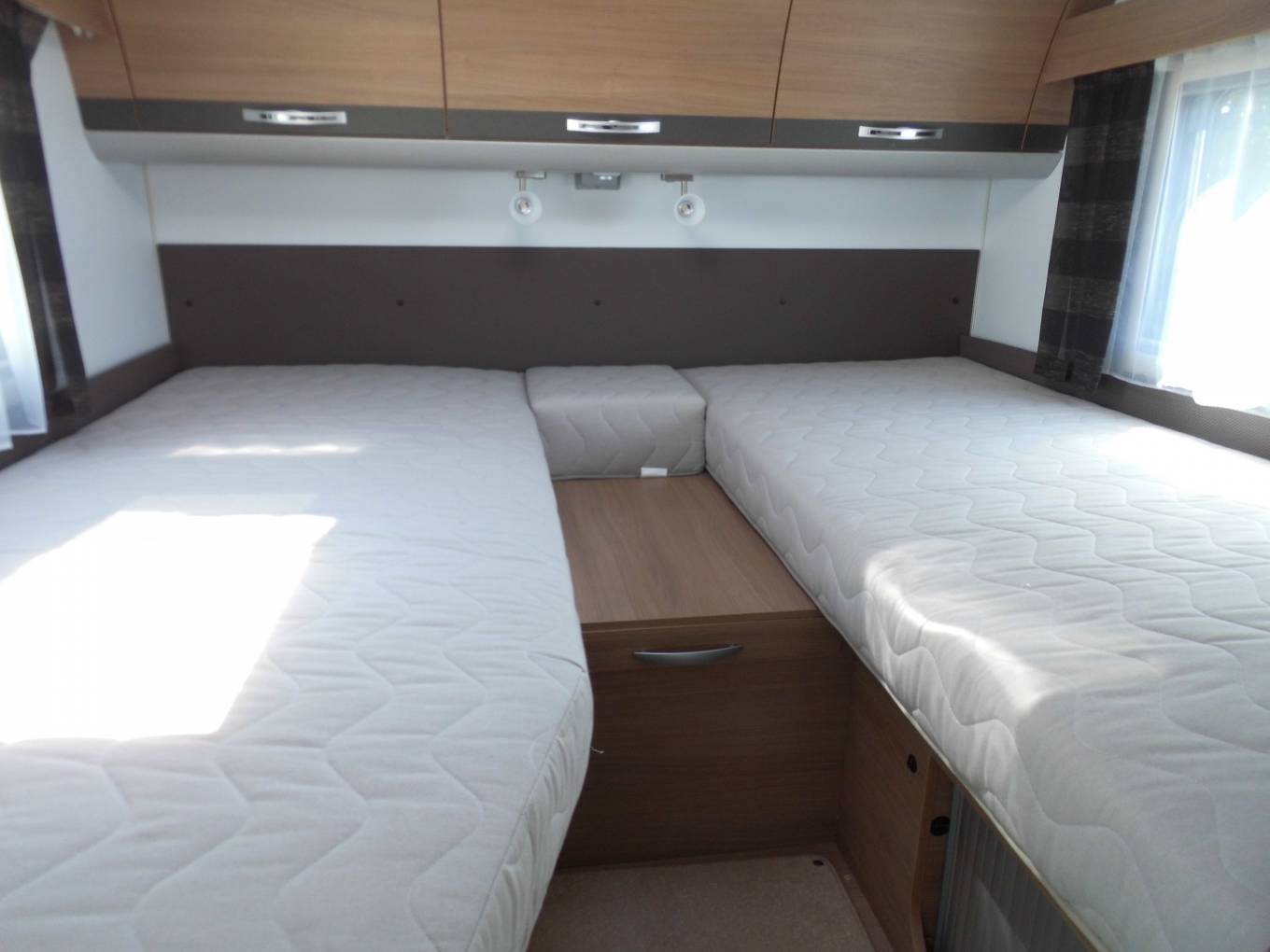 This 3 berth Adria motorhome has 4 belted seats and weighs only 3500 kg so can be driven by anyone with a standard UK driving licence. At 6.62 metres long she has plenty of room to live in but is not too large to manoeuvre around country lanes and park in supermarkets. At the rear you have 2 fixed single beds which means you don't have to clamber over your partner at night time to go to the loo. These can be made in to a fixed double if you so wish. Under the beds is access to the large rear garage which can also be accessed via the external side door. There is plenty of overhead locker storage space and there is an Avtex TV/DVD player.