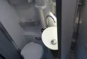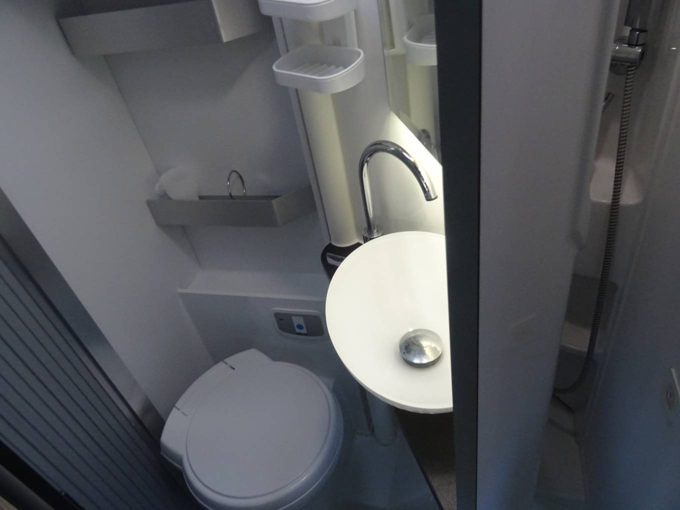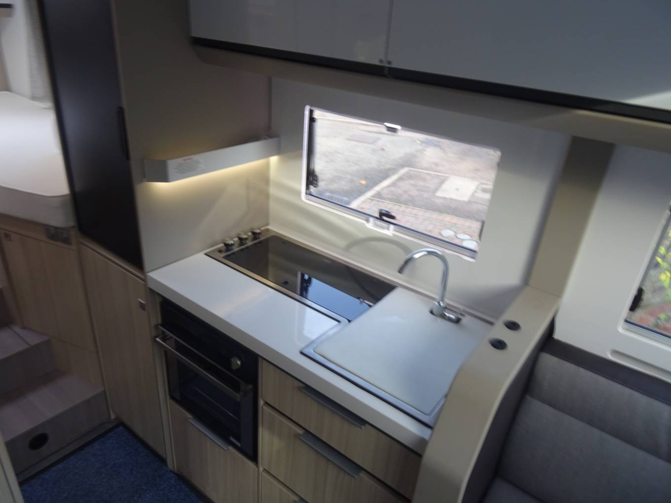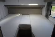 At the rear we have a German style bed layout with 2 parallel singles and a pull out centre for an easy double. There are adjustable back rests for reading and steps up. There is excellent under bed storage on both sides including a wardrobe and drawer. There are over head lockers with push catches, 2 windows, a sky light, excellent touch and strip lighting and a privacy curtain.