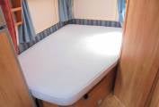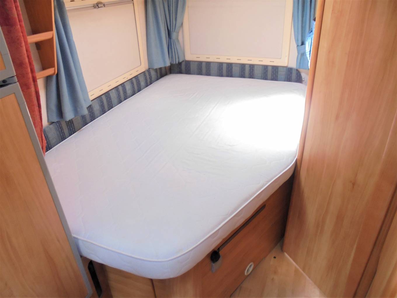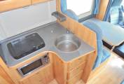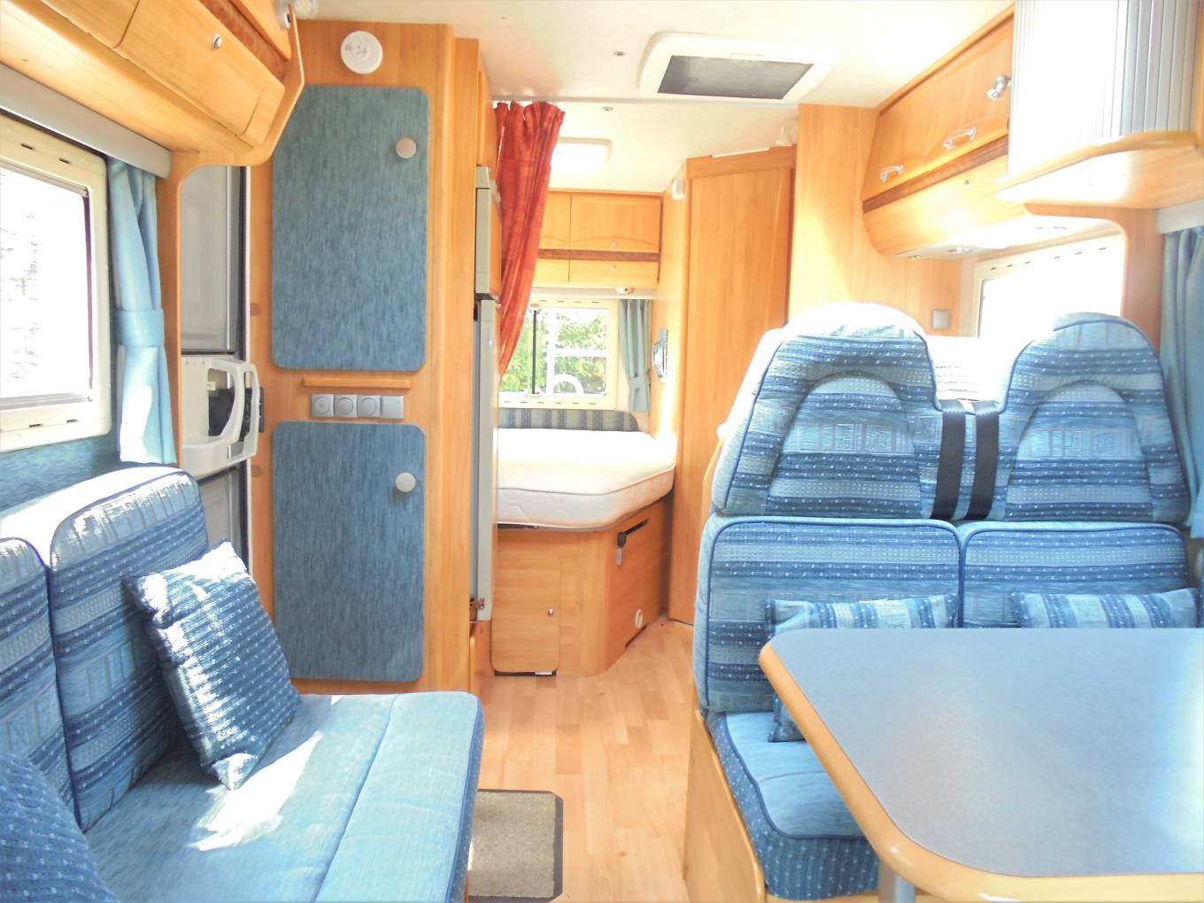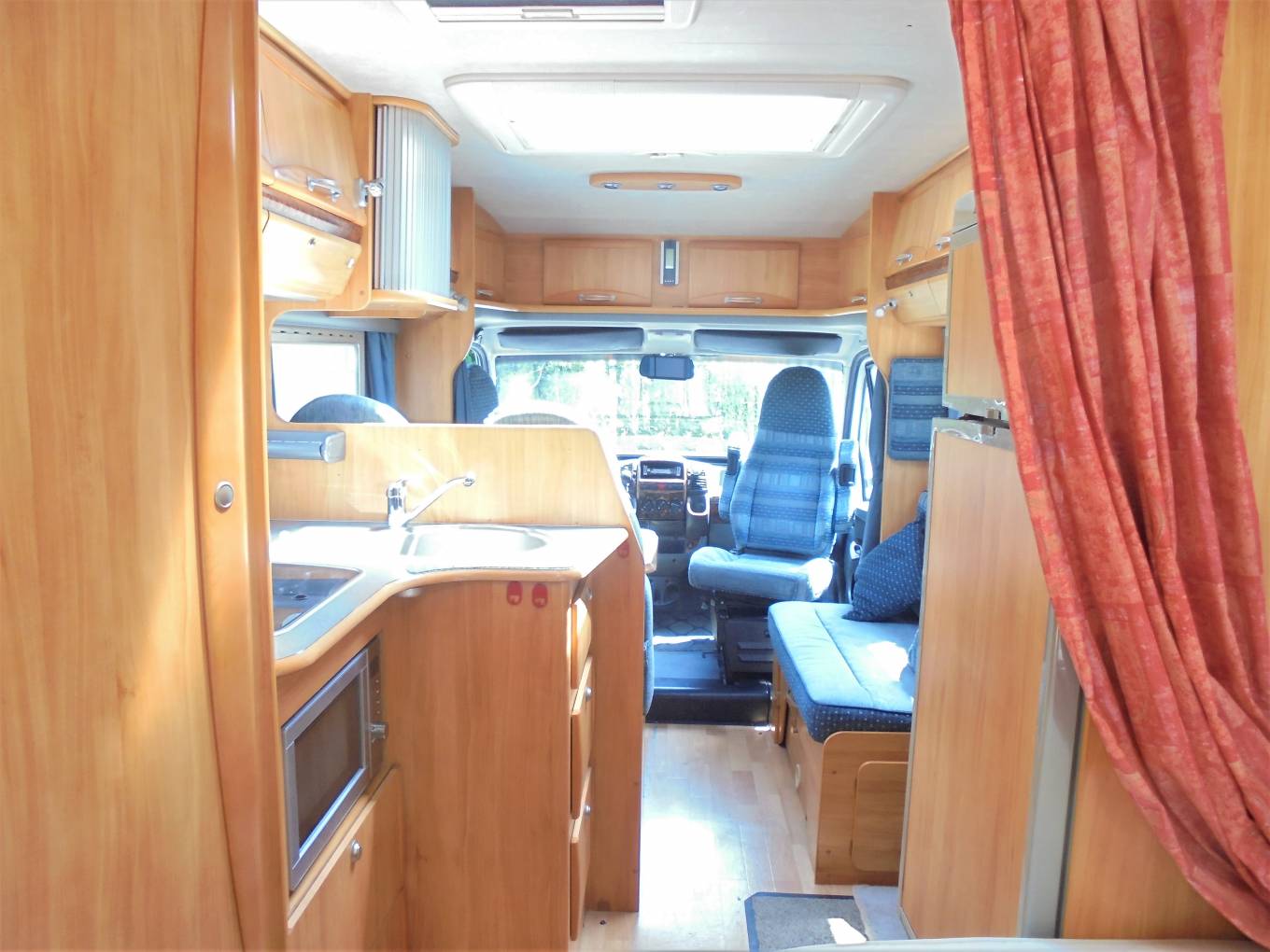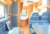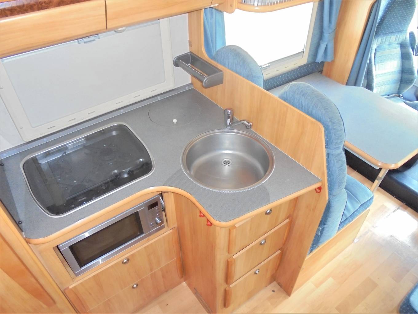 The large fixed rear bed means there's no need to climb ladders or assemble your sleeping area after a long day and the spacious washroom is fitted with a separate shower and toilet.In the lounge area we have the comfortable bench seat incorporating two 3 point safety belts, this can be easily made into a small double bed if required.The interior is particularly pleasant being tastefully trimmed out in blue and there is a high quality feel to the cabinets and fixtures.The kitchen benefits from a large fridge and separate freezer, 3 ring gas hob,microwave,sink and ample work surface /storage.There are numerous overhead lockers throughout the motorhome and a large garage to the rear under the fixed bed.